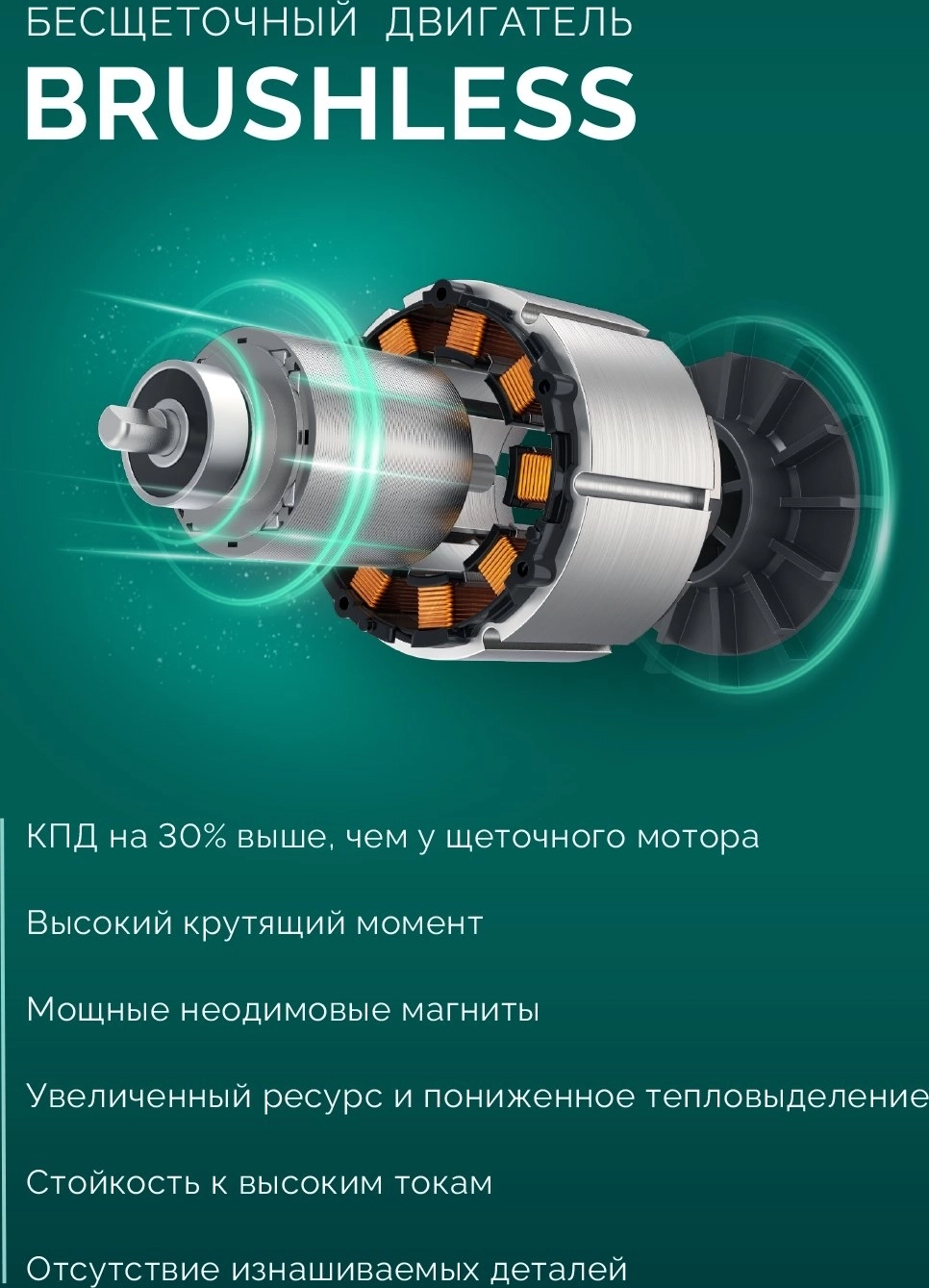 - - высокий крутящий момент – в 2 раза выше, чем у аналогичного щеточного двигателя,
