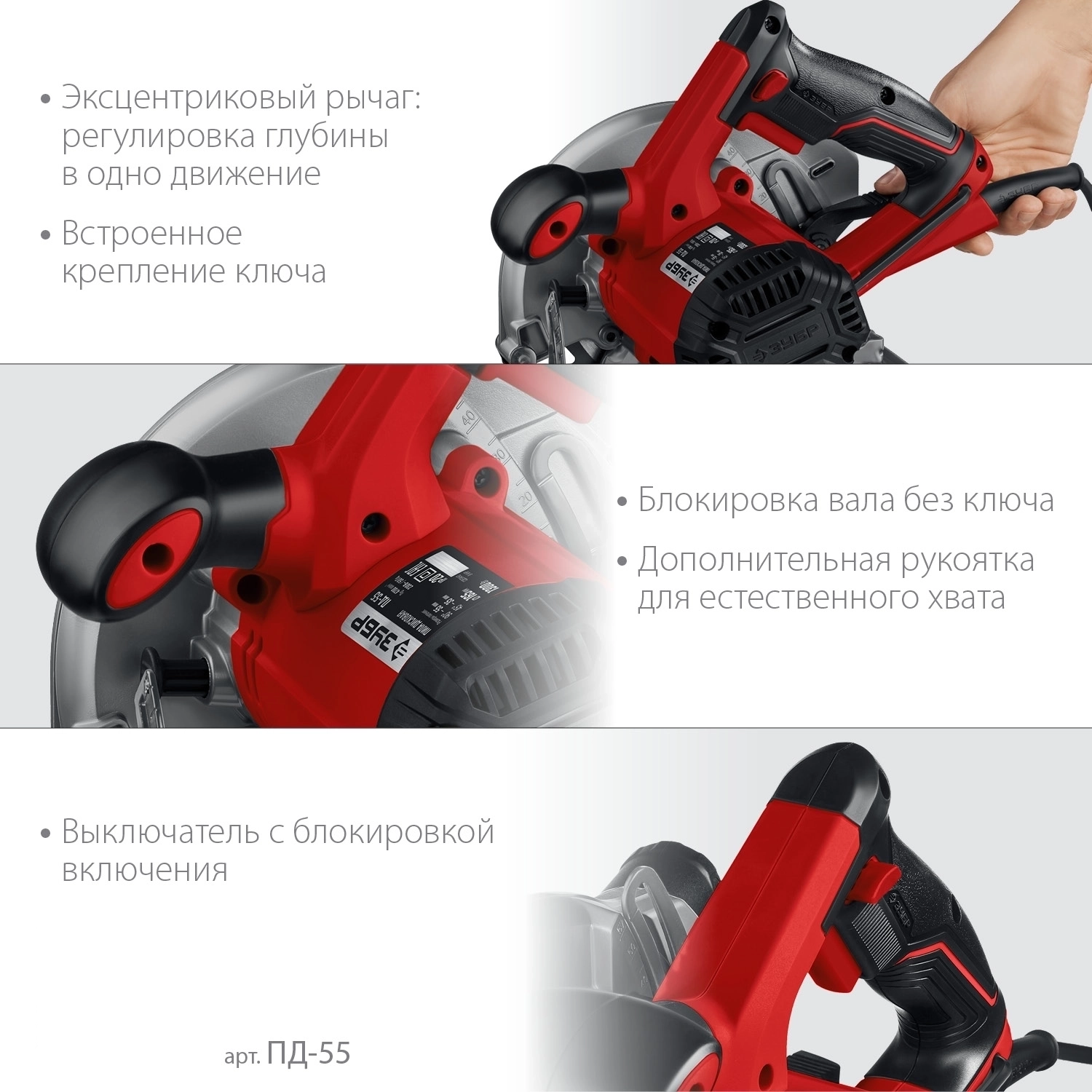 - Бесступенчатая регулировка глубины и угла пиления для точных работ