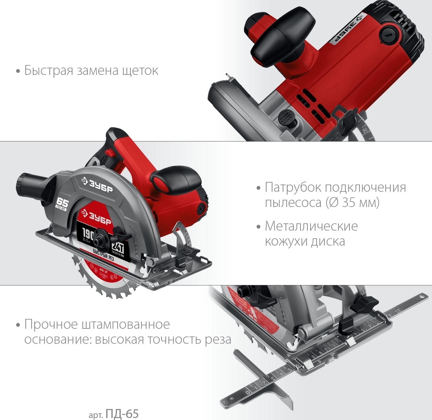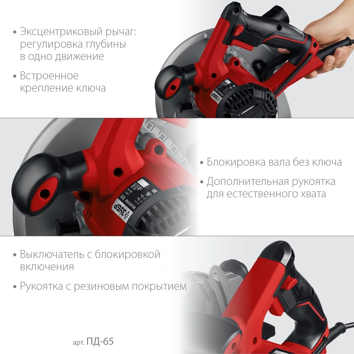 - Бесступенчатая регулировка глубины и угла пиления для точных работ