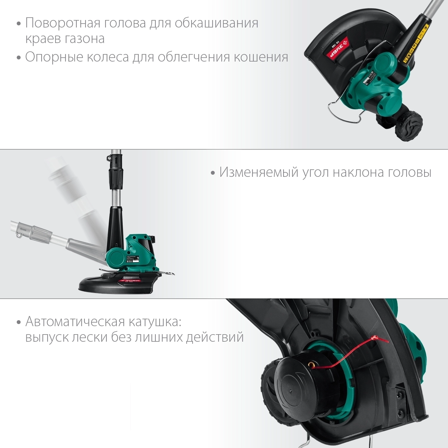 - С помощью поворотной головы легко обкашивать края клумб, дорожек и газонов