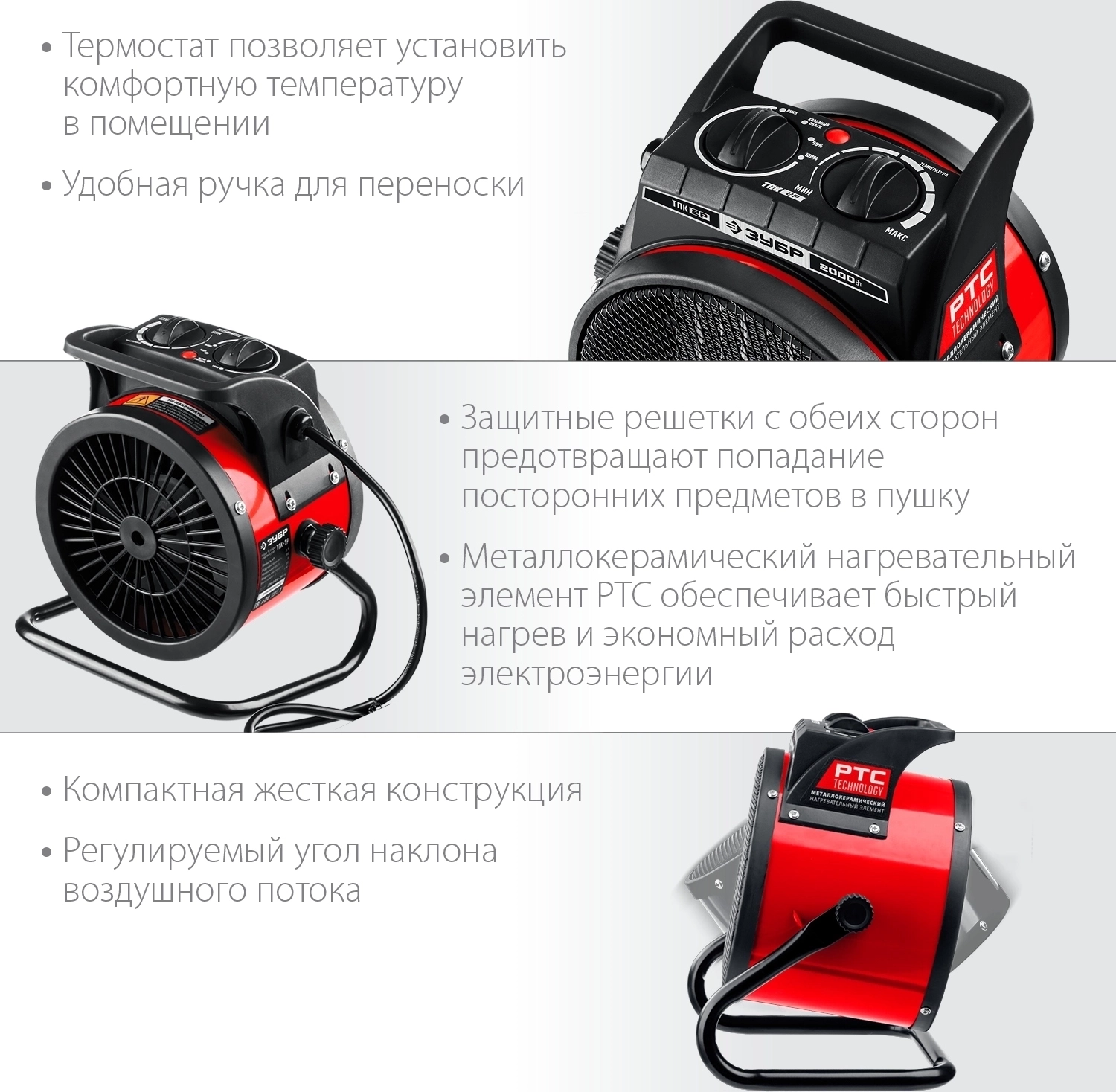 Электрические тепловые пушки ЗУБР серии ТПК–Р компактные пушки в круглом корпусе для обогрева небольших помещений. Благодаря небольшим размерам тепловую пушку легко переносить и хранить. Устройства оснащены долговечным металлокерамическим нагревательный элементом, обеспечивающий быстрый равномерный нагрев, экономное потребление электроэнеергии и не сушит воздух. Механический терморегулятор поддерживает нужную температуру нагрева. За счет большой площади теплообмена и небольшой температуры нагрева элемента, воздух быстро прогревается. Изделие можно оставлять на долгое время и не бояться за сохранность помещения, так как конструктивные меры безопасности защищают Вас и изделие при нештатных ситуациях.