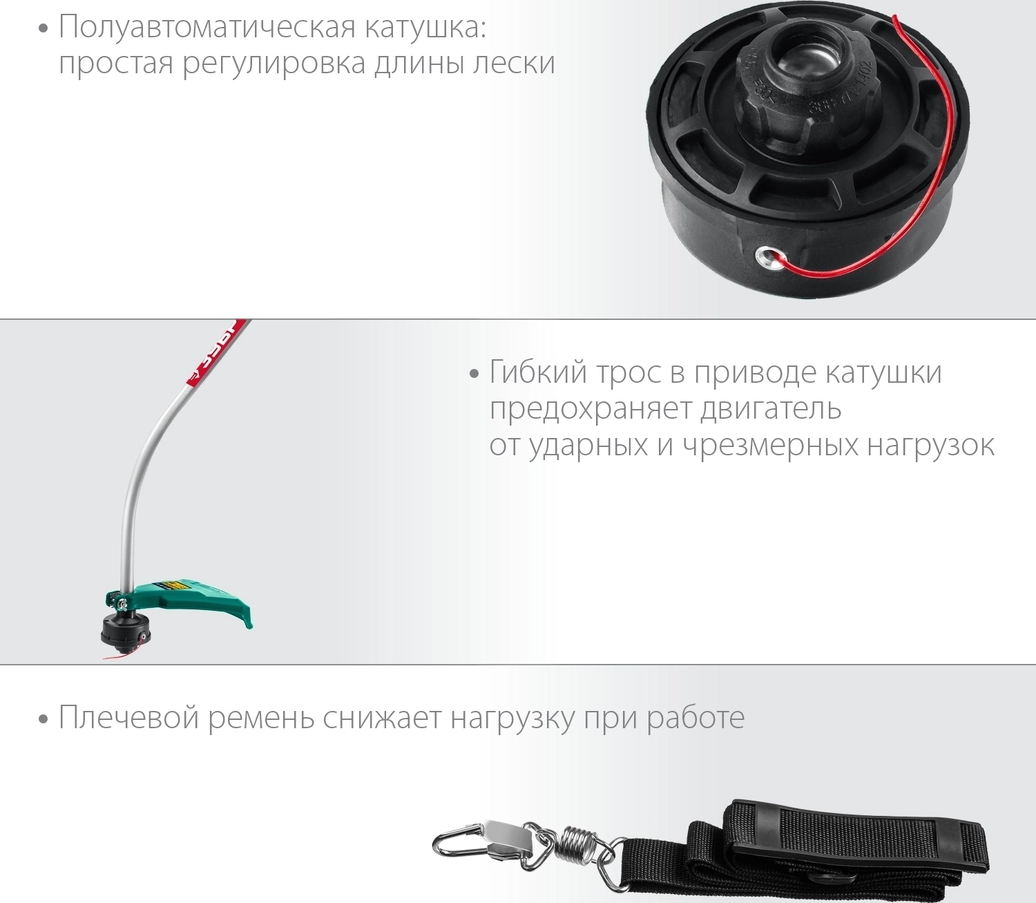 - Идеальная развесовка (благодаря верхнему расположению двигателя) и плечевой ремень увеличивают маневренность и облегчают эксплуатацию