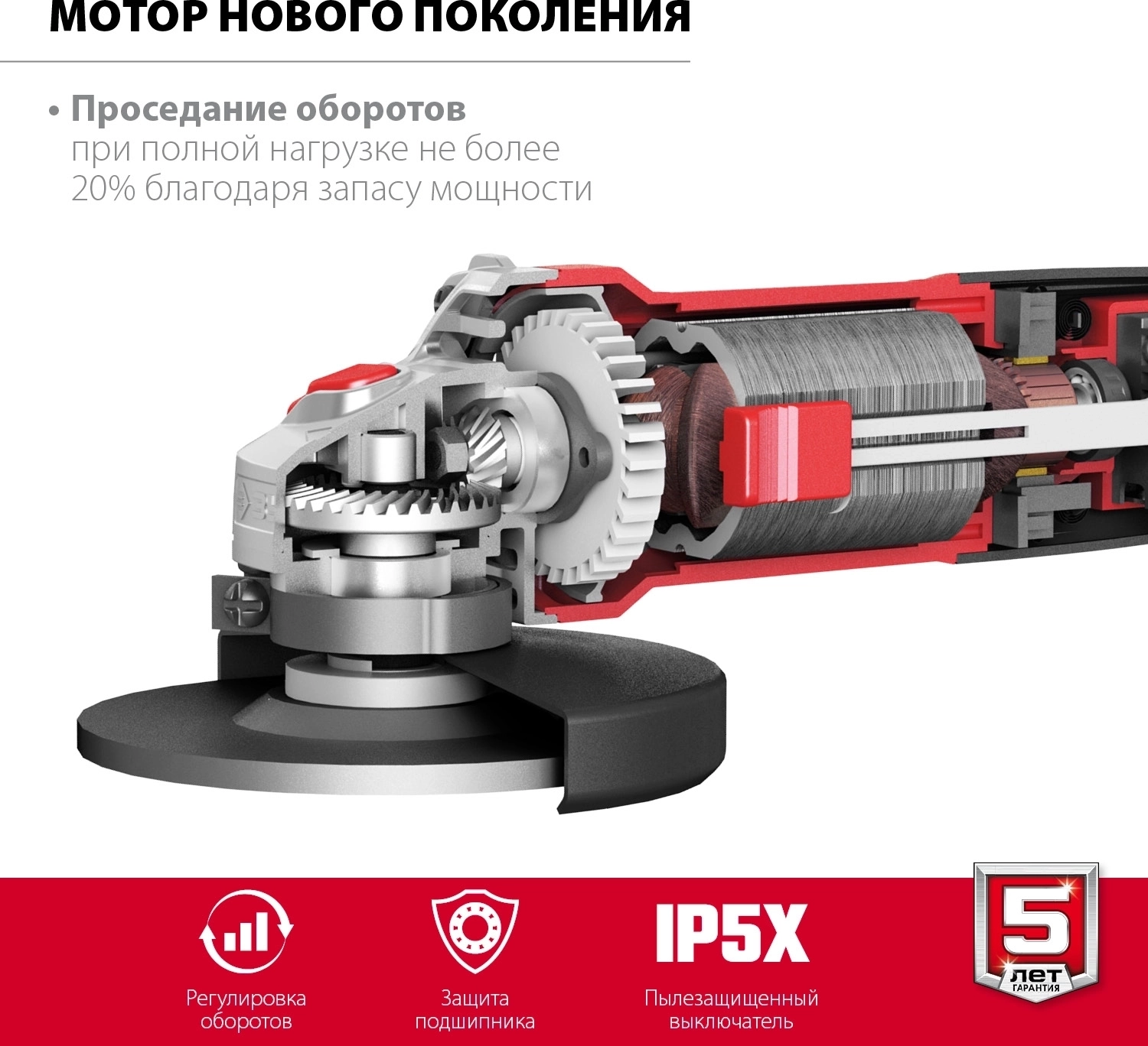 - Защита от перегрузки помогает отключить двигатель при заклинивании диска без угрозы повреждения изделия и травм оператора