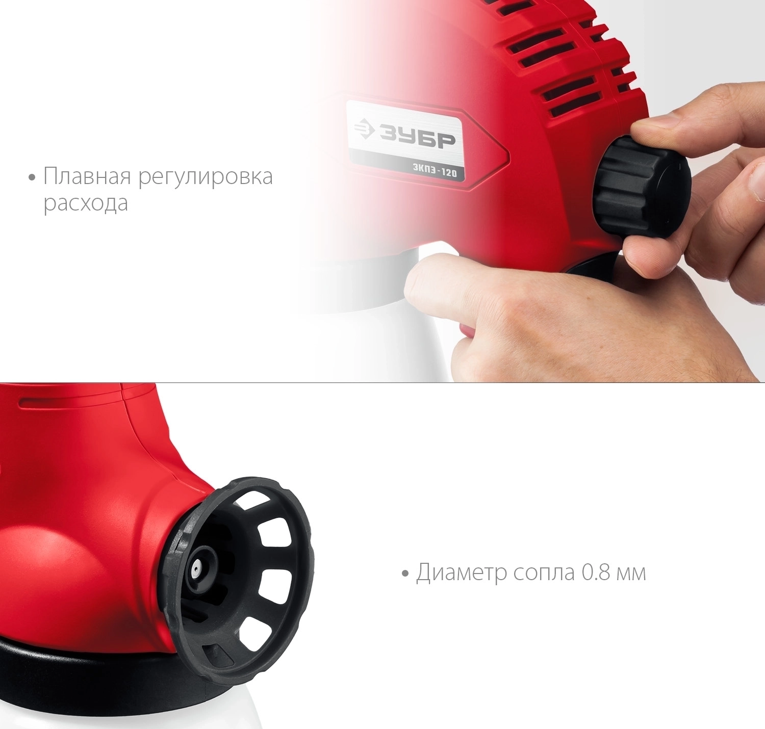 Универсальный инструмент для распыления большинства лакокрасочных материалов. Теперь стало просто и быстро окрасить поверхность, обработать антисептиком, покрыть лаком, нанести узоры. Исключение затрат на расходные материалы (валики, кисти), уменьшение расхода наносимого материала, отсутствие разводов и потеков, существенное ускорение работы - главные преимущества использования краскопультов ЗУБР