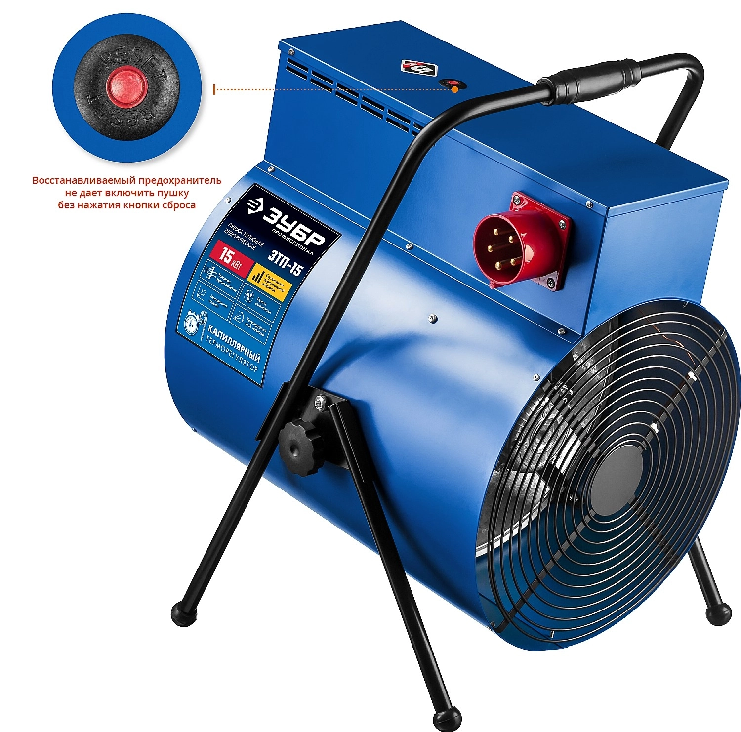 Профессиональные электрические тепловые пушки с питанием от трехфазной электрической сети эффективны для быстрого и направленного обогрева складских и производственных помещений, ангаров и мастерских, благодаря большой площади нагревательных элементов и мощным двигателем вентилятора. Конструктивные особенности обеспечивают защиту как пользователя, так и тепловой пушки в случае возникновения нештатных ситуаций. ЗУБР - тепло всегда и везде