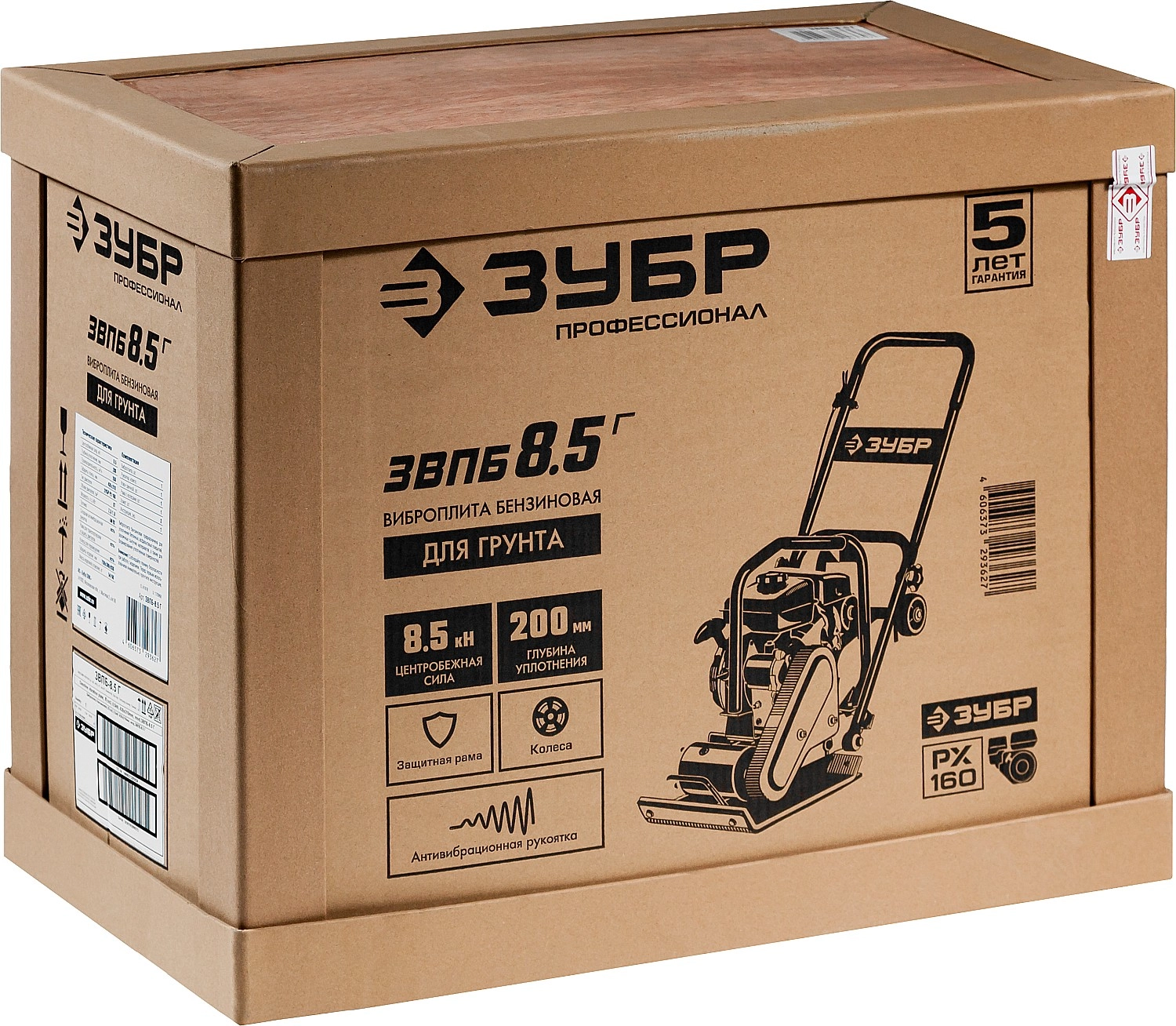 Новая линейка строительной техники для профессионалов. Виброплита бензиновая ЗУБР ЗВПБ-8.5 Г специально разработана для уплотнения смешанного грунта, песка, а также тротуарной плитки (при установке резиновой наклад- ки на подошву). Конструкция включает в себя четырехтактный двигатель с защитой от низкого уровня масла, стальную плиту, эффективную систему защиты оператора от повышенной вибрации, а также складную роликовую опору для перемещения по ровной поверхности. Правильная геометрия плиты позволяет ей самоочищаться от грунта.
