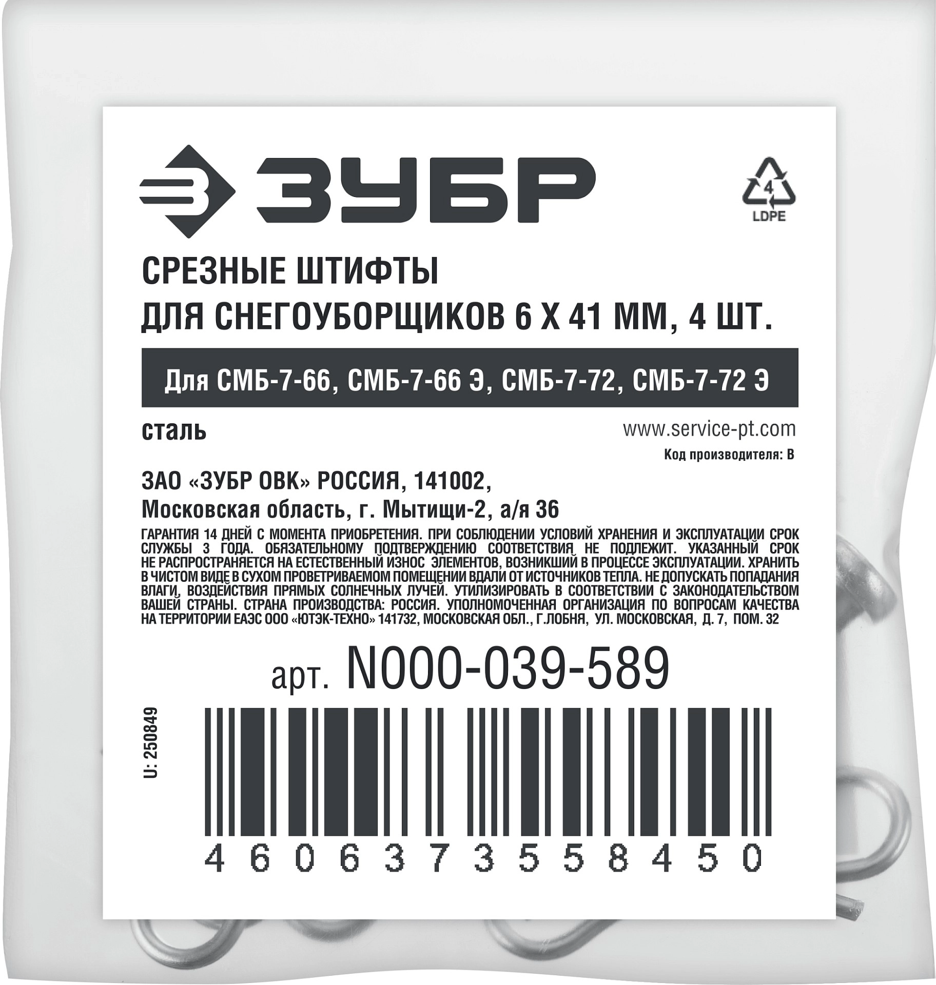 Срезные штифты для снегоуборщиков ЗУБР 6х41 мм, 4шт.