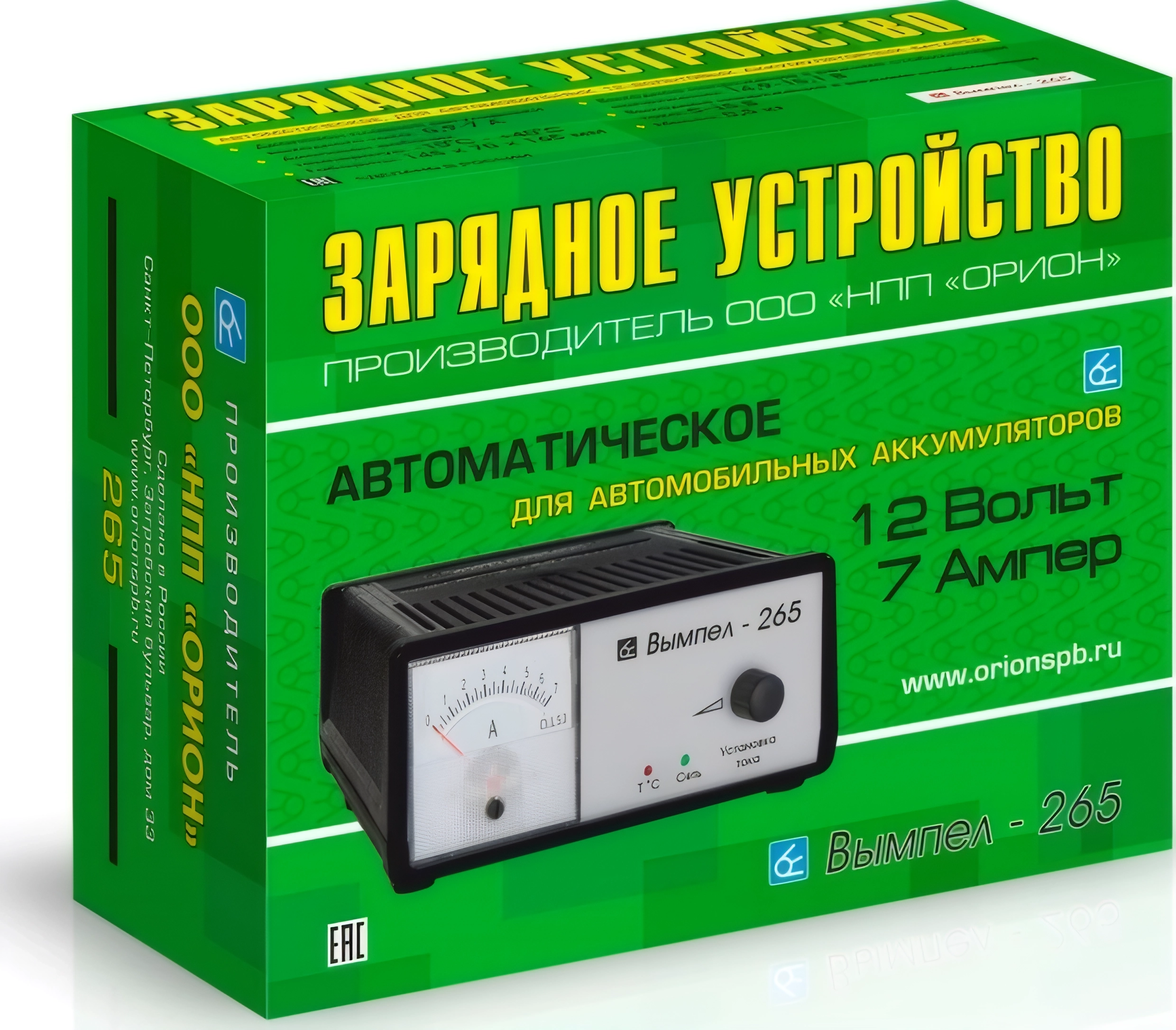 Зарядное устройство Вымпел 265 для 12-вольтовых автомобильных и мотоциклетных аккумуляторных батарей - регулировка тока в диапазоне 0.4-6 А, электронная схема защиты от перегрева, стрелочный индикатор тока