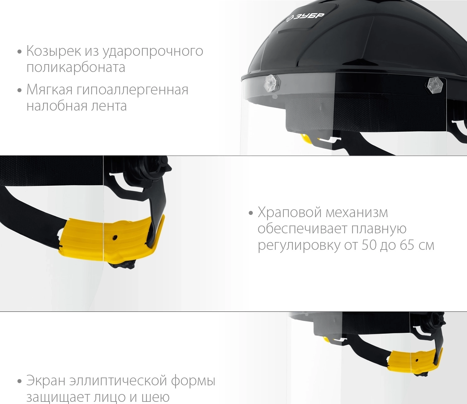 - Ударопрочный козырёк для защиты головы