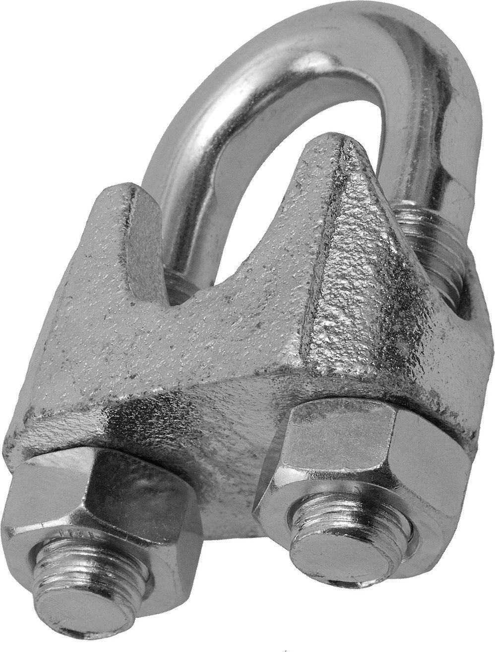 Для формирования петель на концах троса. Используются на тросах без оплетки ПВХ (если трос имеет оплетку, ее необходимо снять перед установкой зажима). Свободный конец троса закладывается в зажим (конец троса должен выходить из зажима на расстояние не менее 1/2 диаметра троса). Далее в петлю троса закладывается коуш, после которого трос помещается в зажим с другой стороны отверстия. Сверху помещается прижимная скоба, которую небходимо крепко зафиксировать с помощью гаек. Свободный конец троса рекомендуется обмотать изолентой для предотвращения разматывания троса после установки. Перед использованием необходимо убедиться, что гайки на зажимах закручены полностью. Рекомендуемое расстояние между зажимами равно шестикратному диаметру троса. Минимальное количество зажимов - 3 шт.