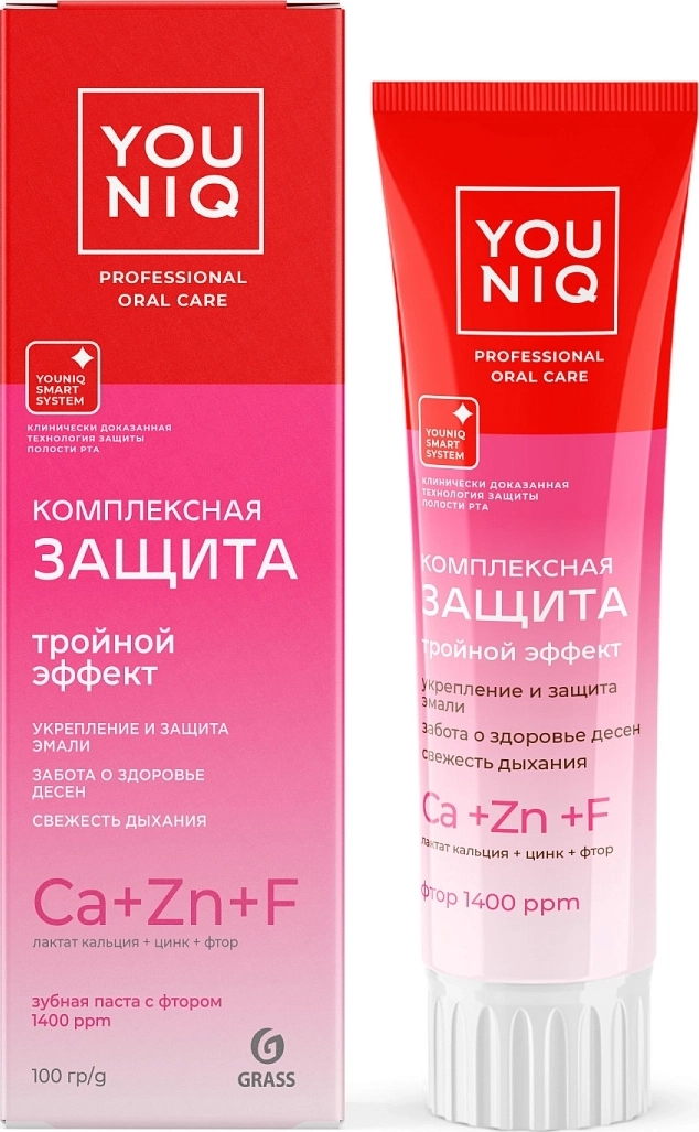 Зубная паста YOUNIQ «Комплексная защита» со фтором (1400ppm), лактатом кальция и цинком обладает комплексным действием для эффективного ухода за полостью рта. Укрепляет эмаль зубов и предотвращает развитию кариеса.