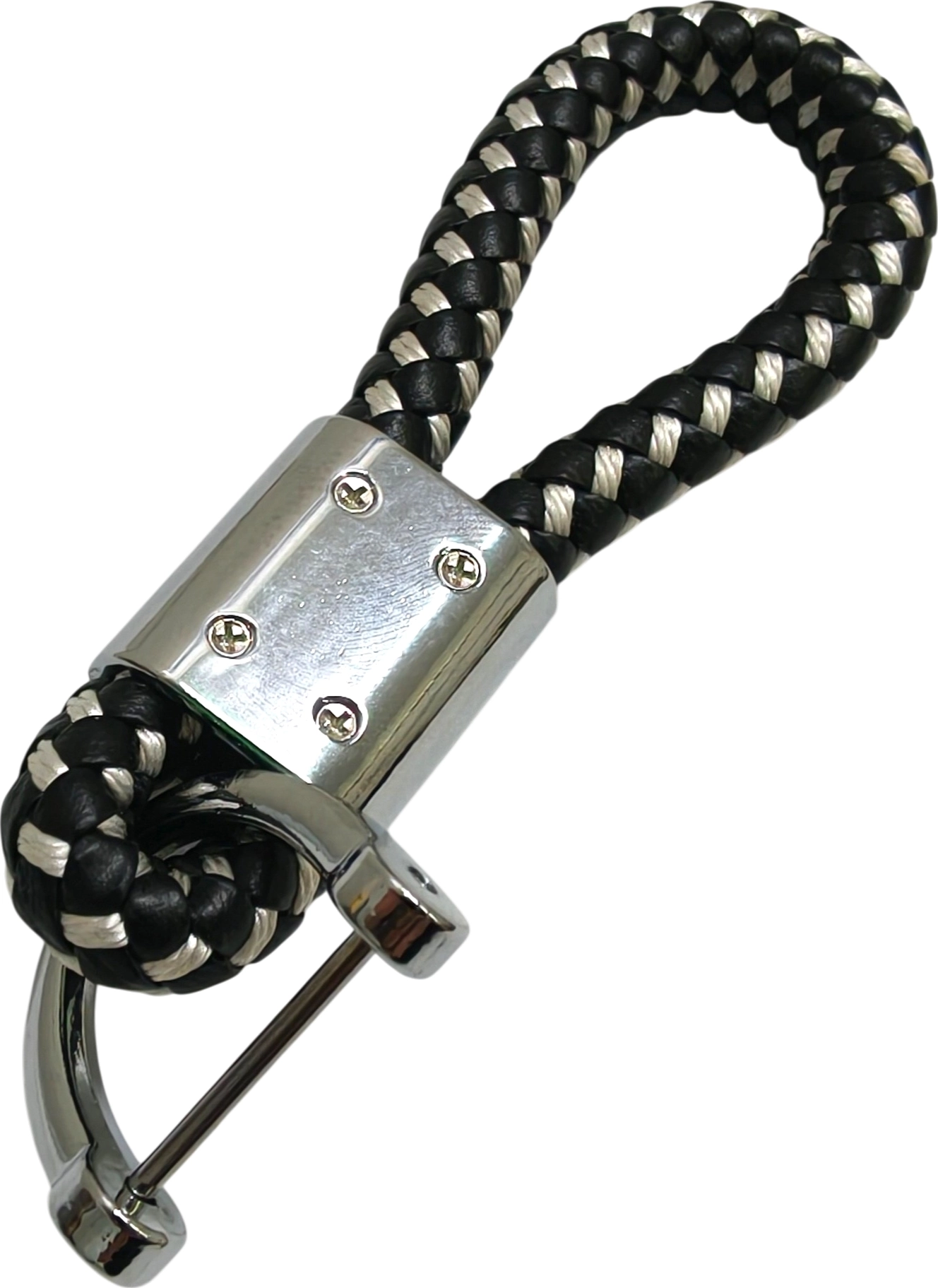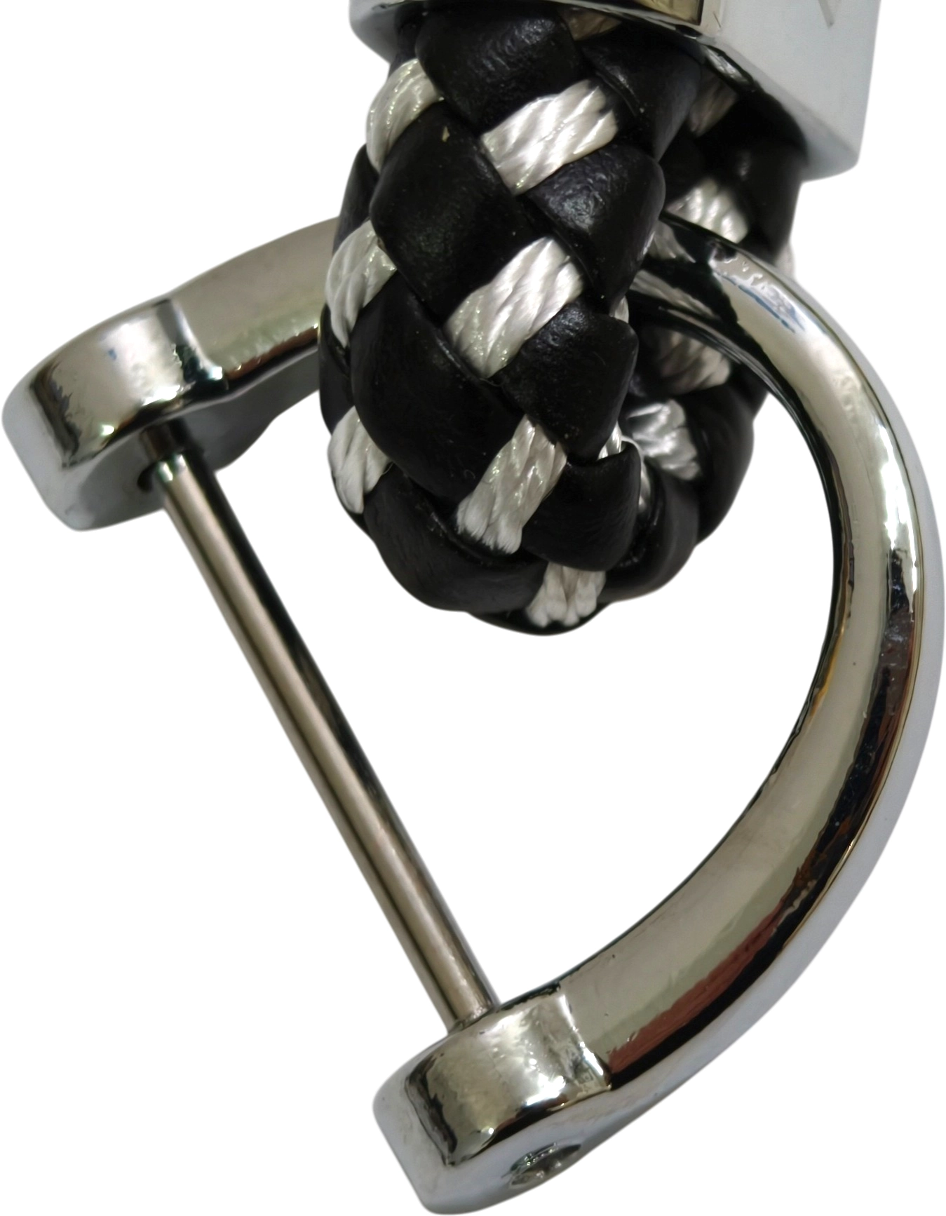 Брелок-ремешок для ключей выполнен из искусственной кожи (экокожи) высокого качества, которая переплетена с белой нитью из полиэстера. В основании ремешка находится пластина с логотипом марки автомобиля, которая выполнена из хромированного металла. Крепиться ремешок к брелоку с помощью скобы, которая закрывается шпилькой с фиксацией винтиком. Такой способ крепления позволяет надежно удерживать ключи на ремешке. Длинна ремешка 95 мм, ширина скобы 25 мм. Ширина скобы по внутренним краям 19 мм.