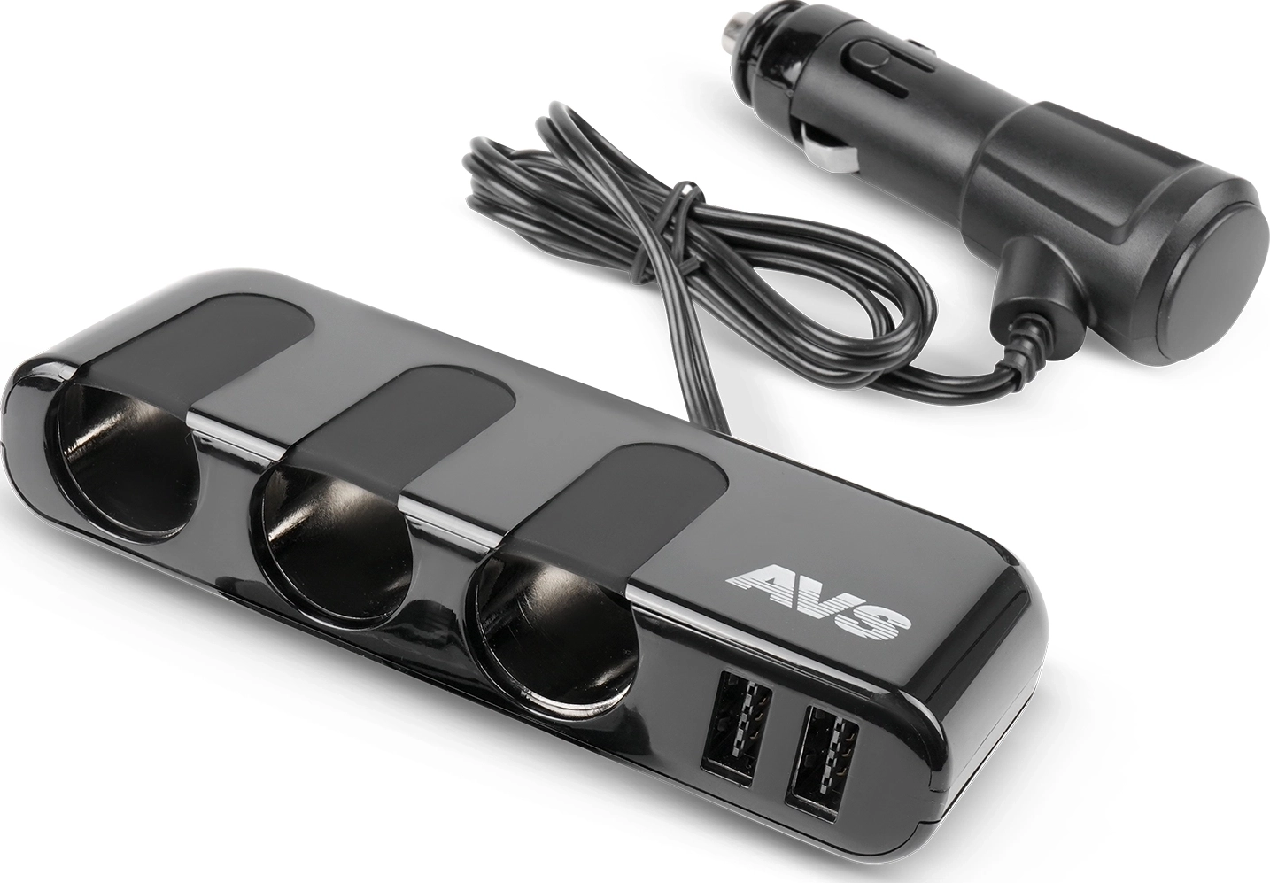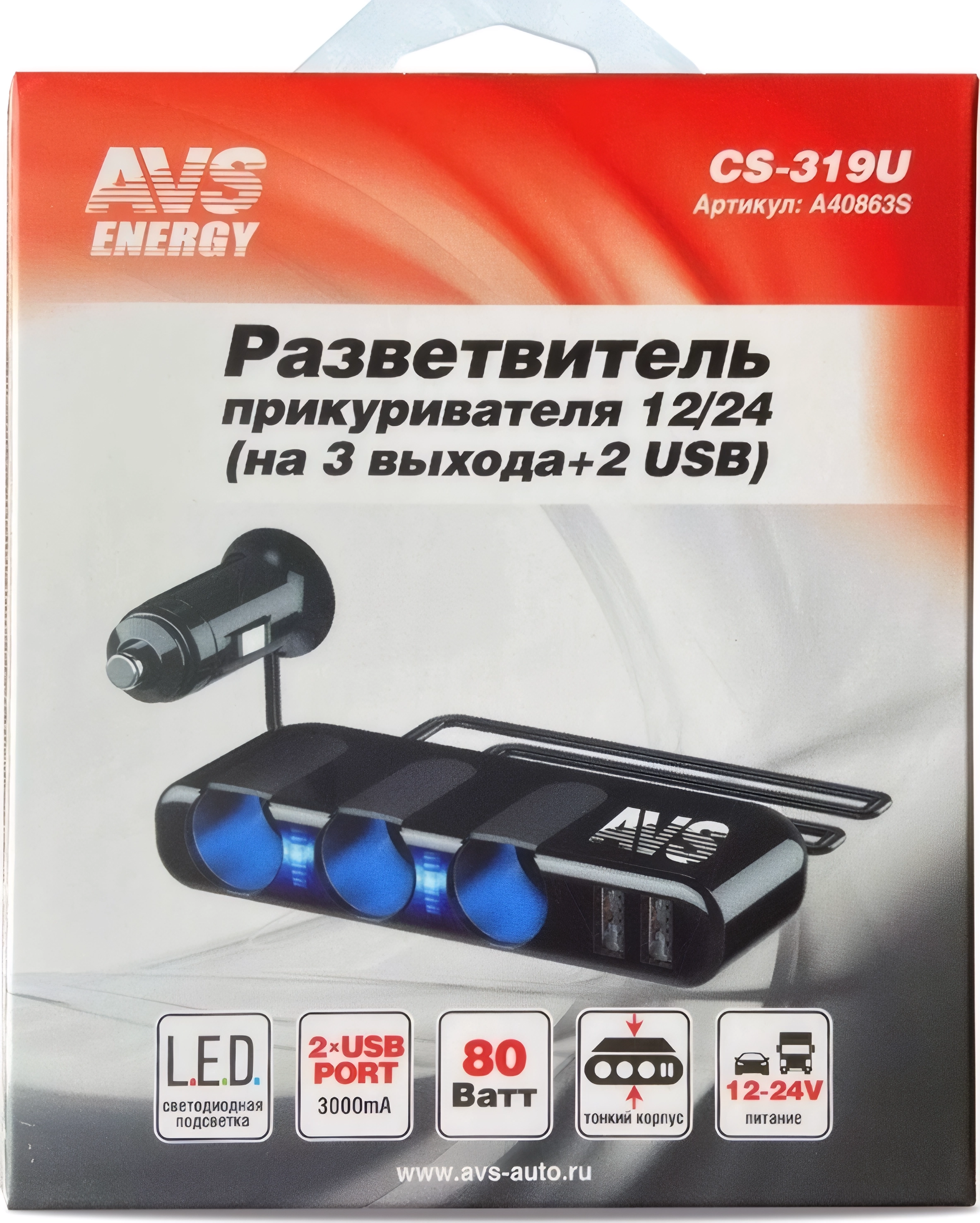 Разветвитель прикуривателя AVS CS-319U на 3 выхода + 2 USB - для авто с напряжением 12B и 24В, максимальный выходной ток 7 ампер