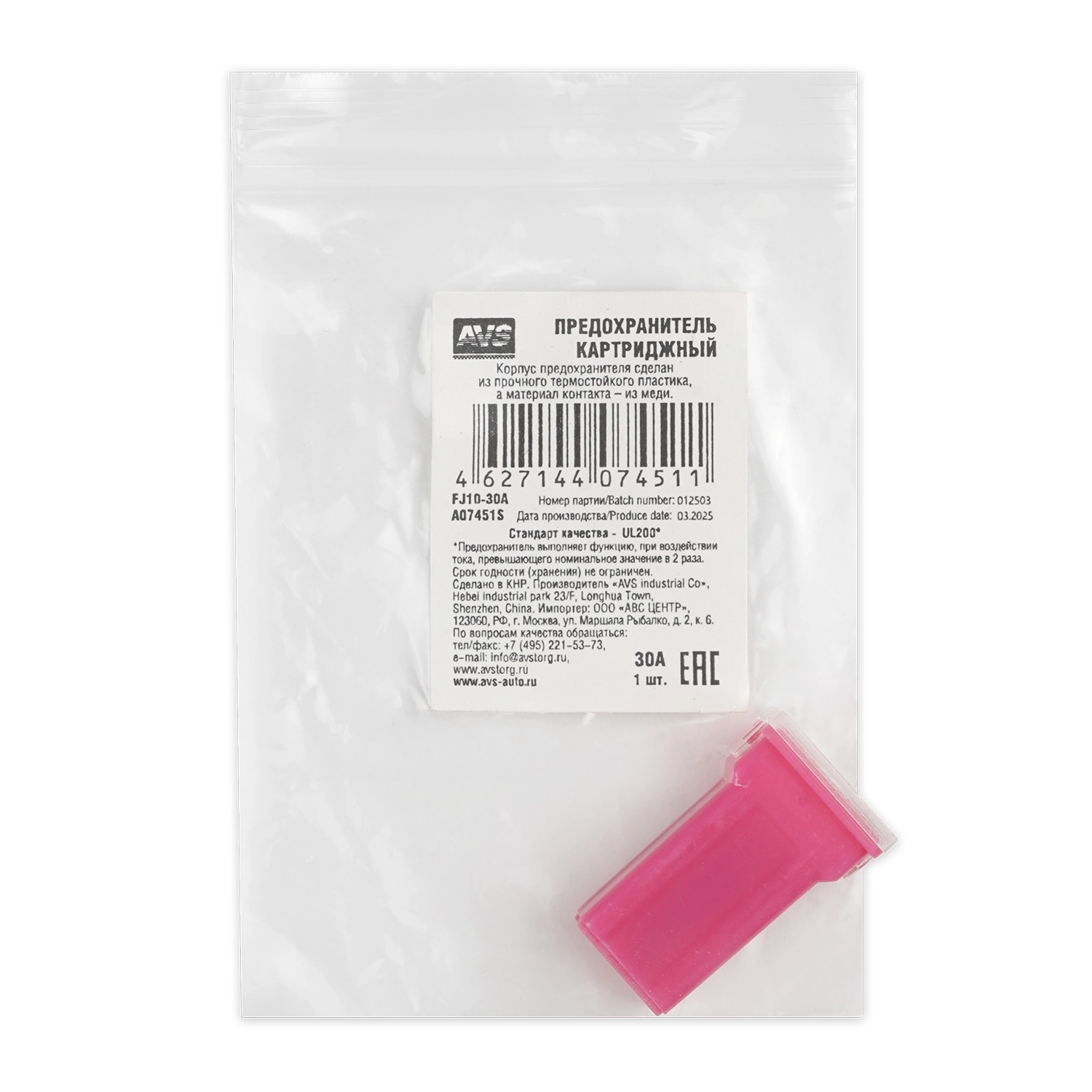 Предохранитель картриджный AVS FJ10-30A в пакете