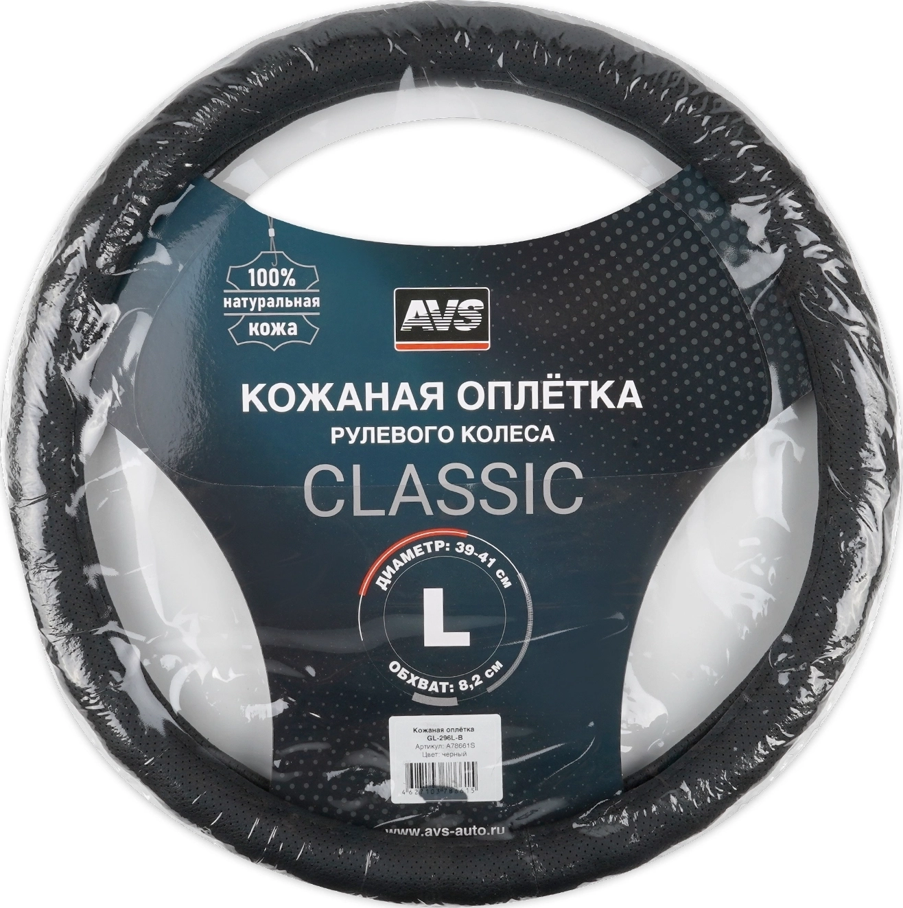 Оплетка на руль AVS GL-296L-B - материал натуральная кожа, размер L, цвет черный