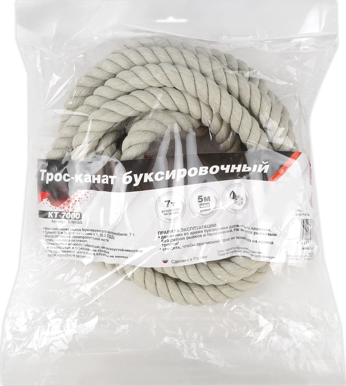 Трос-канат буксировочный без крюков AVS KT-7000 - разрывная нагрузка 7 тонн, длина 5 метров
