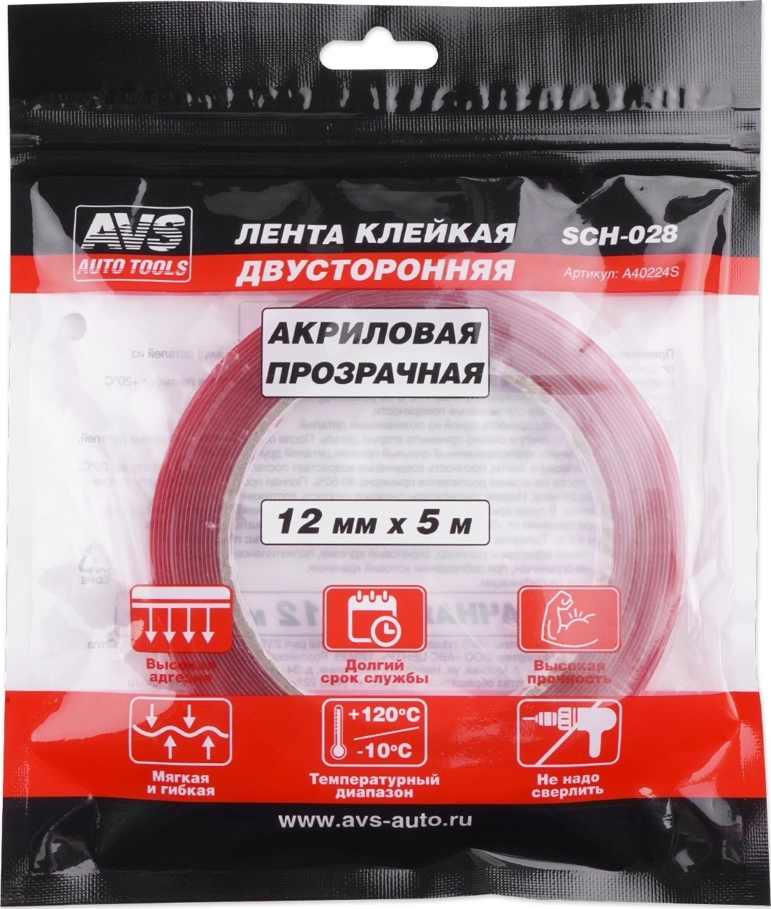 Лента клейкая двусторонняя AVS SCH-028 (1шт.) 12 mm x 5 m, толщина 1 мм, цвет прозрачный, акриловая основа
