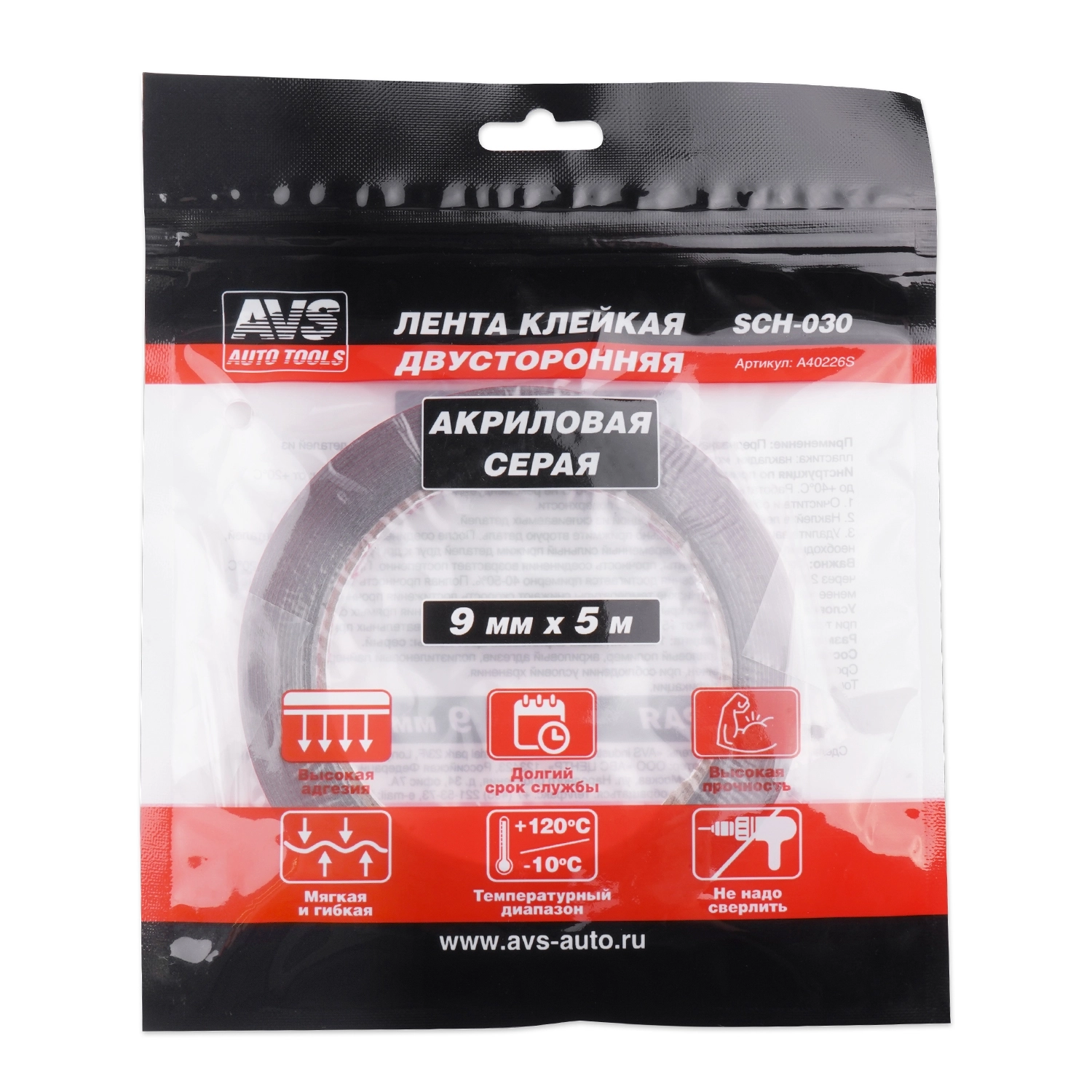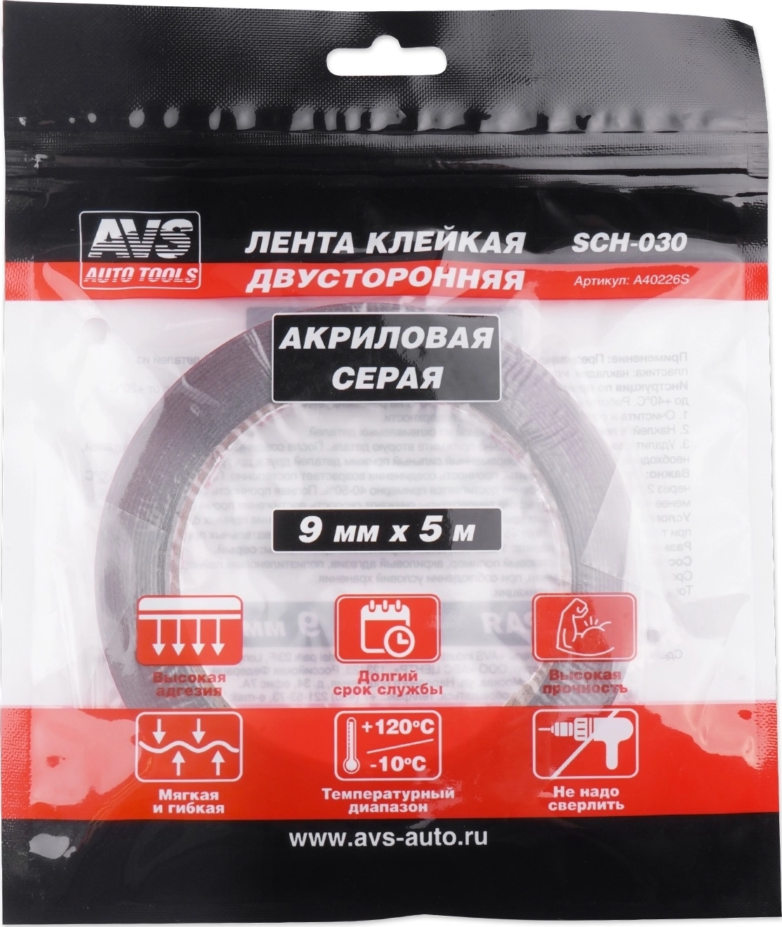 Лента клейкая двусторонняя AVS SCH-030 (1шт.) 09 mm x 5 m, толщина 1 мм, цвет серый, акриловая основа