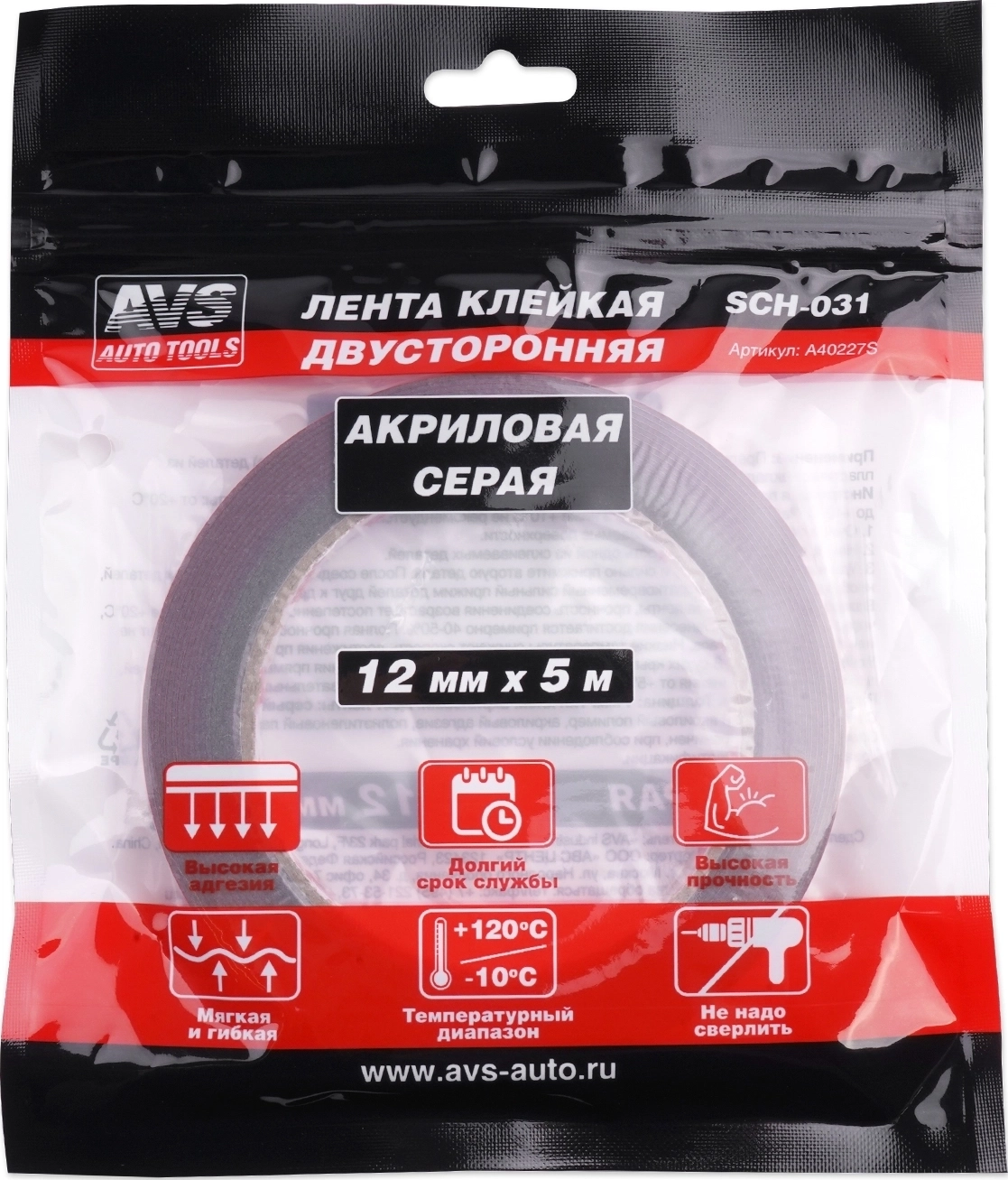 Лента клейкая двусторонняя AVS SCH-031 (1шт.) 12 mm x 5 m, толщина 1 мм, цвет серый, акриловая основа