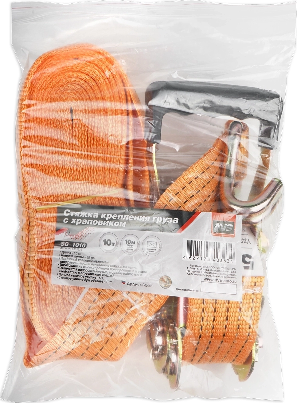 Стяжка крепления груза AVS SG-1010 - длина ремня 10 м, ширина 5,5 см, лента из полипропилена, механизм храповый из стали, тоннажность 10 тонна