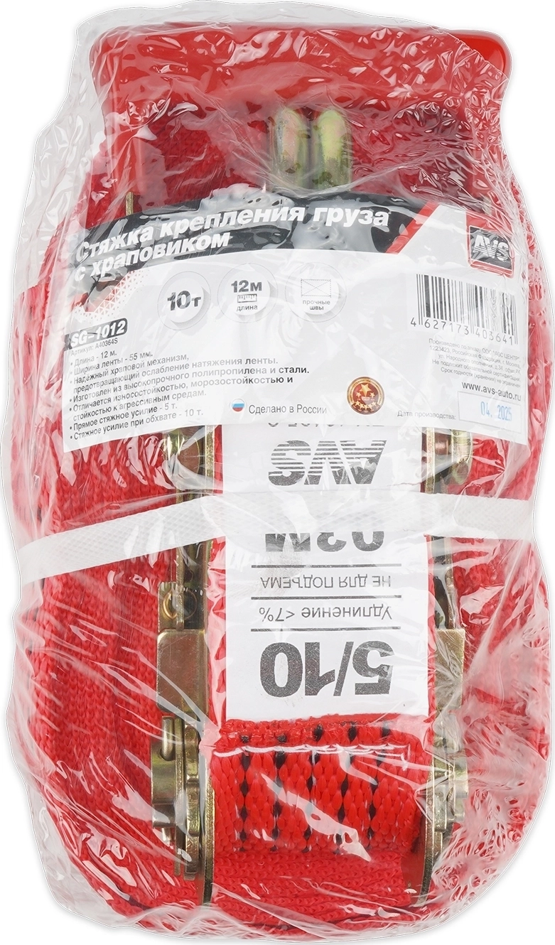 Стяжка крепления груза AVS SG-1012 - длина ремня 10 м, ширина 5,5 см, лента из полипропилена, механизм храповый из стали, тоннажность 12 тонна
