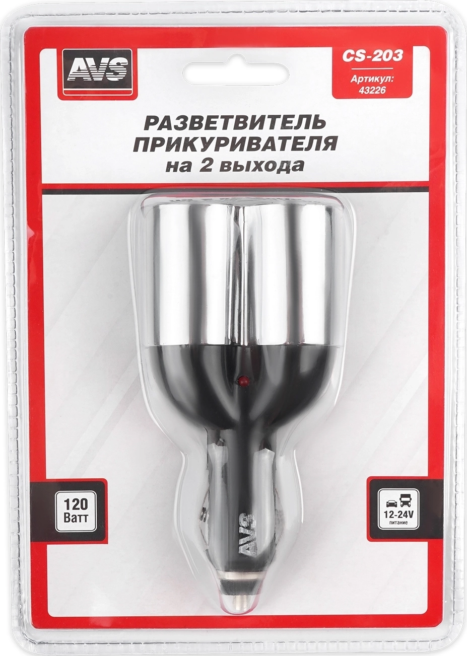 Разветвитель прикуривателя на 2 выхода AVS Energy CS-203 для сети 12 и 24 В - светодиодный индикатор сети, защита от короткого замыкания, надежная фиксация, современный дизайн