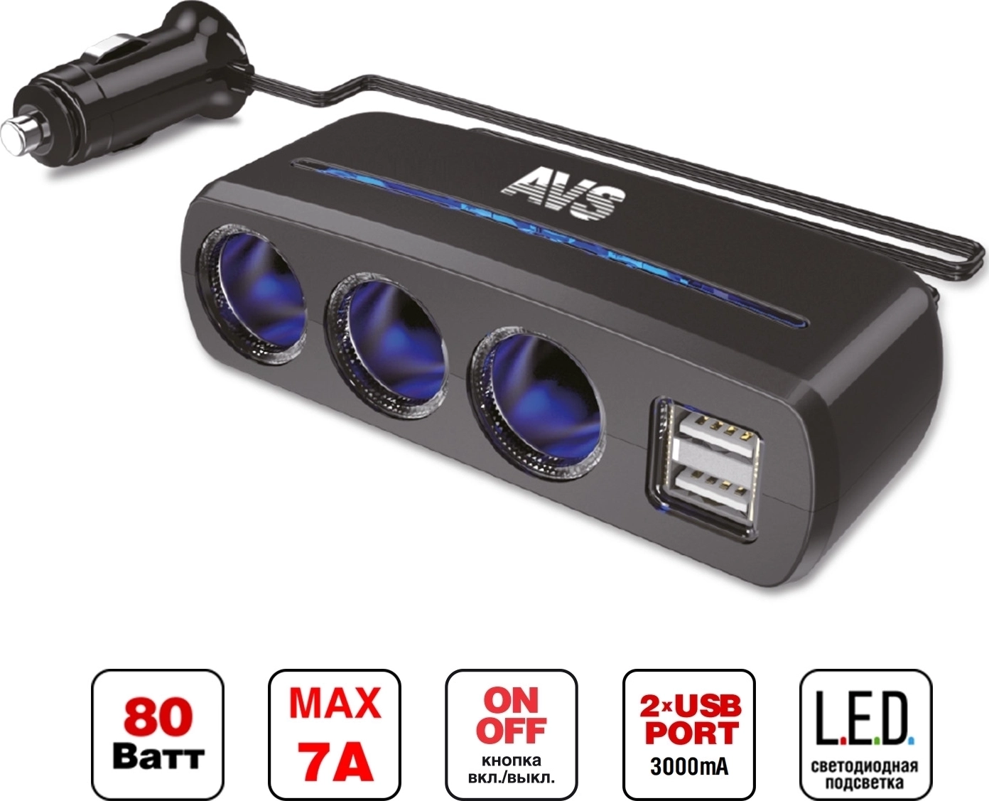 Разветвитель прикуривателя AVS Energy CS-240U - 2 USB, 2 прикуривателя, защита от короткого замыкания, 12/24 V, светодиодный индикатор сети