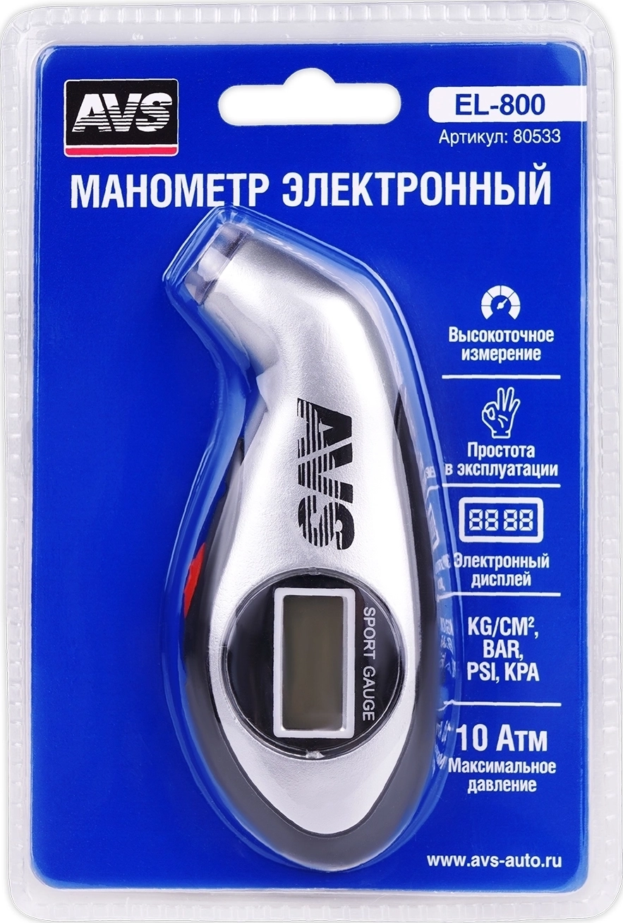 Для контроля за уровнем давления в шинах Вашего автомобиля компания AVS предлагает ознакомиться с шинным манометром AVS Turbo EL-800. Данное устройство отличается высокой точностью измерения и надежностью. Помимо этого, надо отметить относительную простоту в его применении. Он оснащен электронной шкалой измерения и имеет компактные размеры.