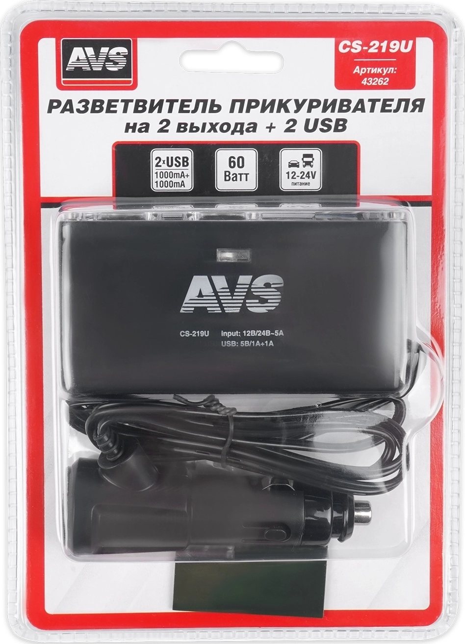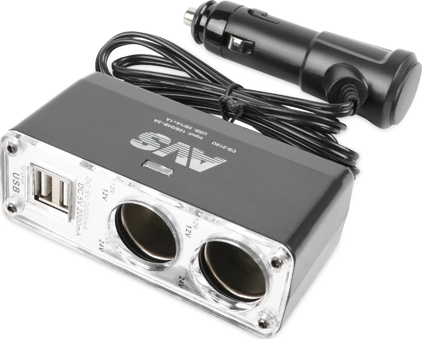Разветвитель прикуривателя AVS Energy CS219U - 2 выхода, 2 USB-порта, светодиодный индикатор сети, защита от короткого замыкания, надежная фиксация, выполнен из прочного тугоплавкого пластика