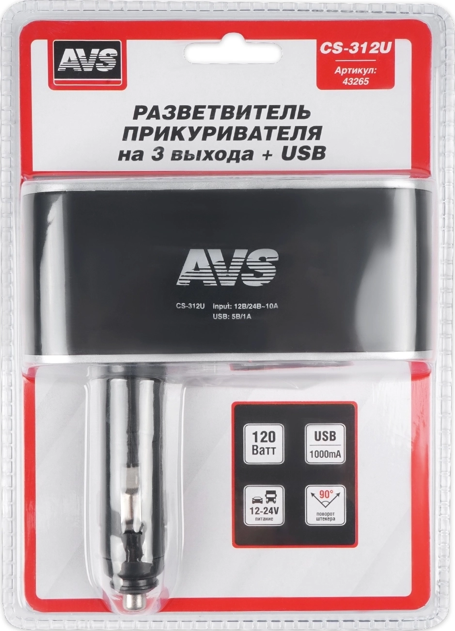 Разветвитель прикуривателя AVS Energy CS312U - 3 выхода, USB-порт, светодиодный индикатор сети, защита от короткого замыкания, надежная фиксация, современный дизайн