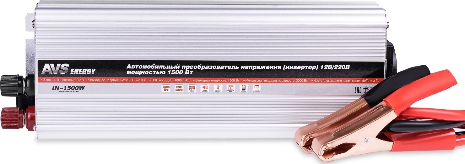 Инвертор AVS Energy IN-1500W - номинальная мощность 1500 Вт, USB-выход, защита от перегрева и короткого замыкания, индикатор для контроля за работой инвертора