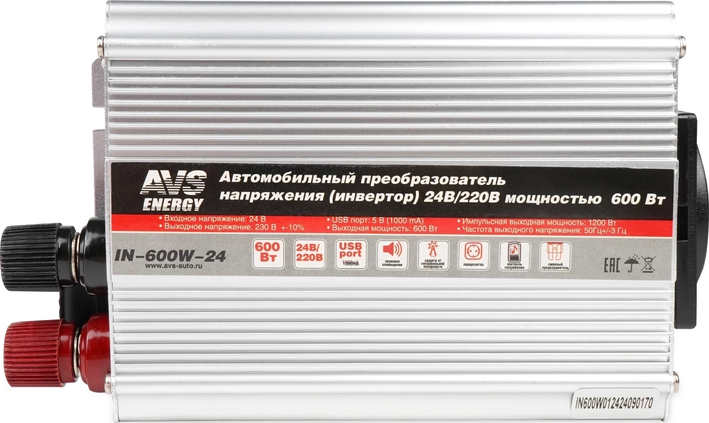 Инвертор AVS Energy IN-400W - номинальная мощность 400 Вт, USB-выход, защита от перегрева и короткого замыкания, индикатор для контроля за работой инвертора