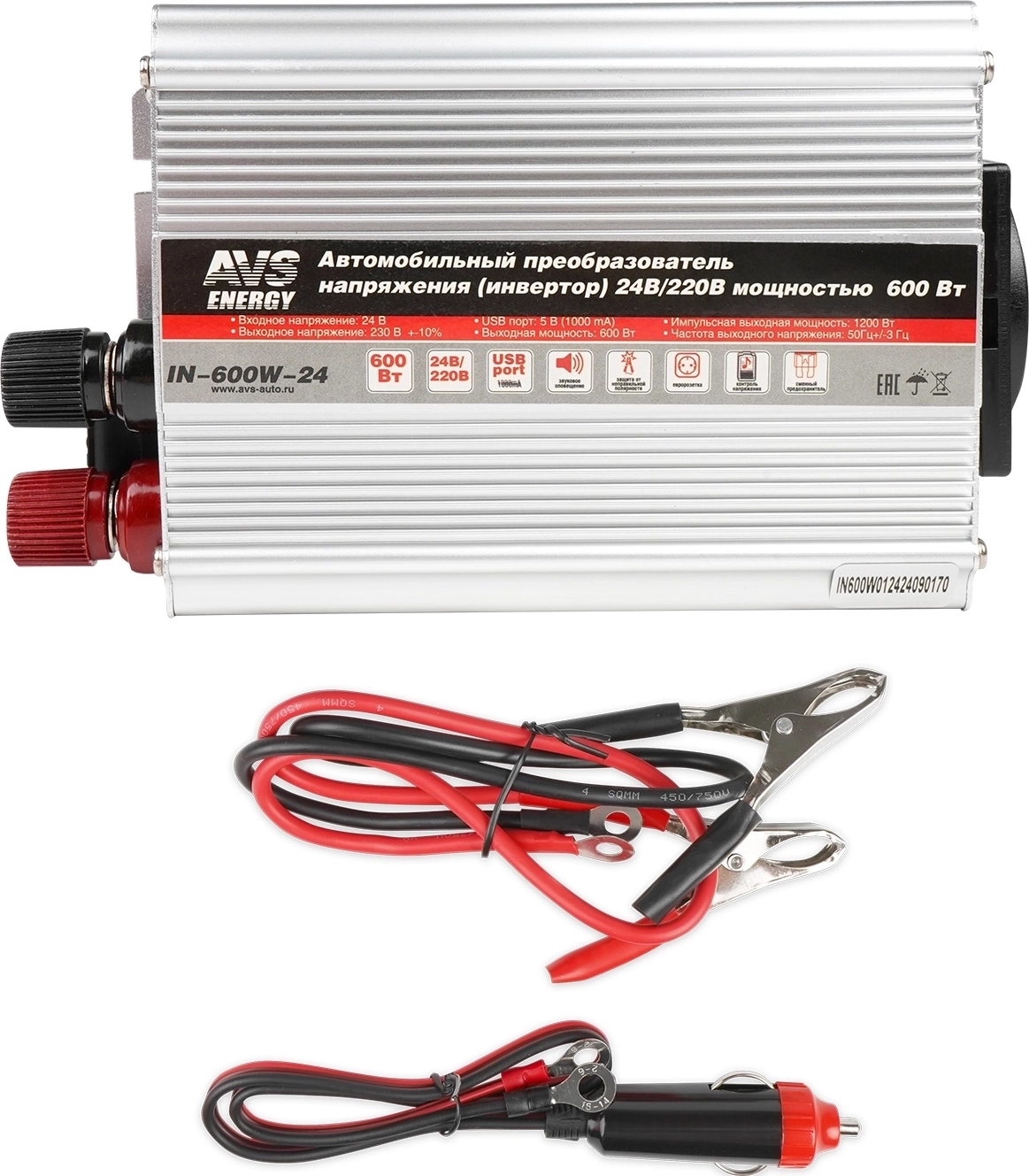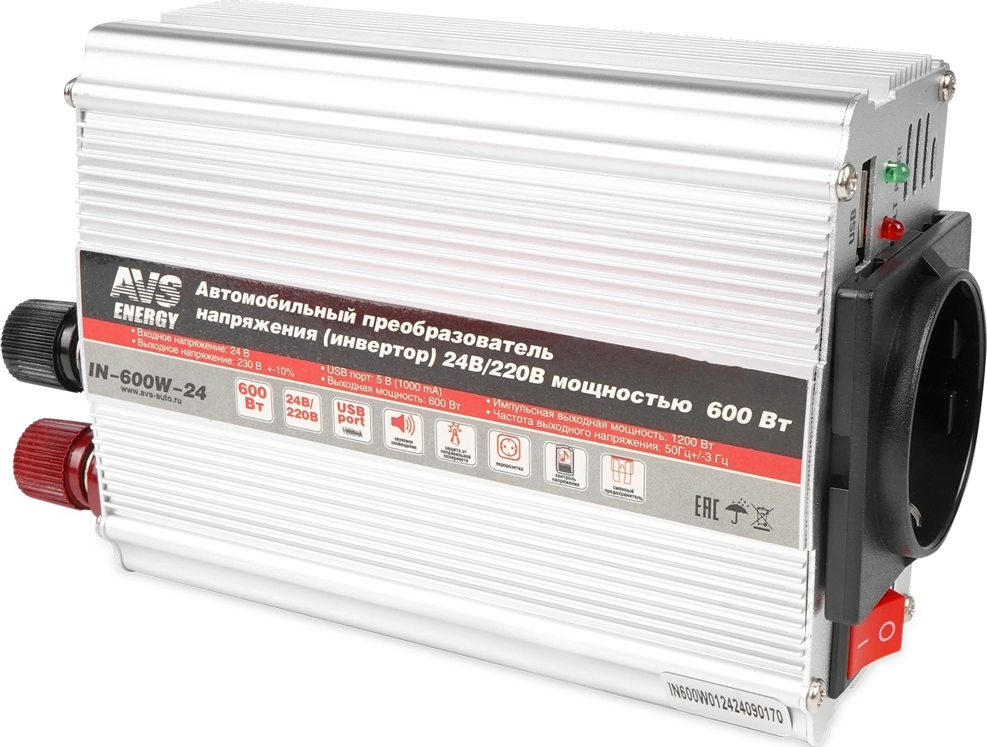 Инвертор AVS Energy IN-600W-24 для преобразования напряжения 24В в 220В - защита от перегрева и короткого замыкания, USB-выход, номинальная мощность 600 Вт, индикатор для контроля за работой инвертора