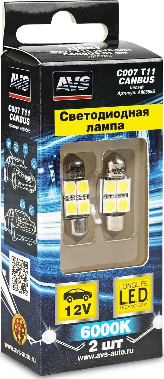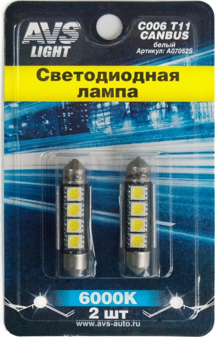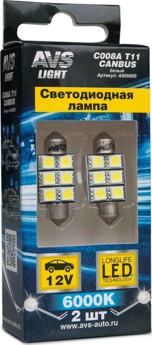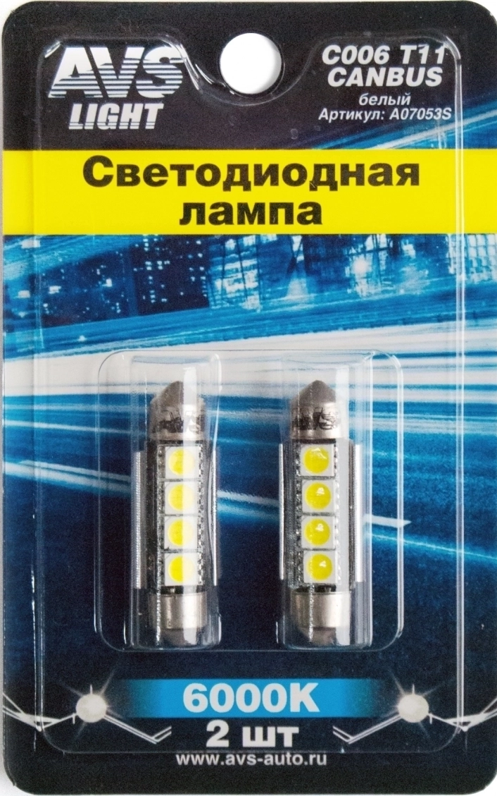 Комплект светодиодных ламп AVS T111 T10 (2 шт.) - (A07039S) напряжение питания 12 В, мощность 0.8 Вт, световой поток 80 лм, цветовая температура 6000K