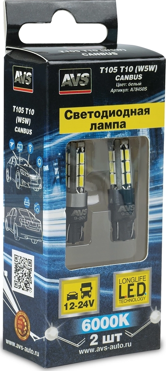 Комплект светодиодных ламп AVS T127 T10 ( A40835S) 2 шт. - напряжение питания 12 В, мощность 1 Вт, световой поток 150 лм, цветовая температура 6000K
