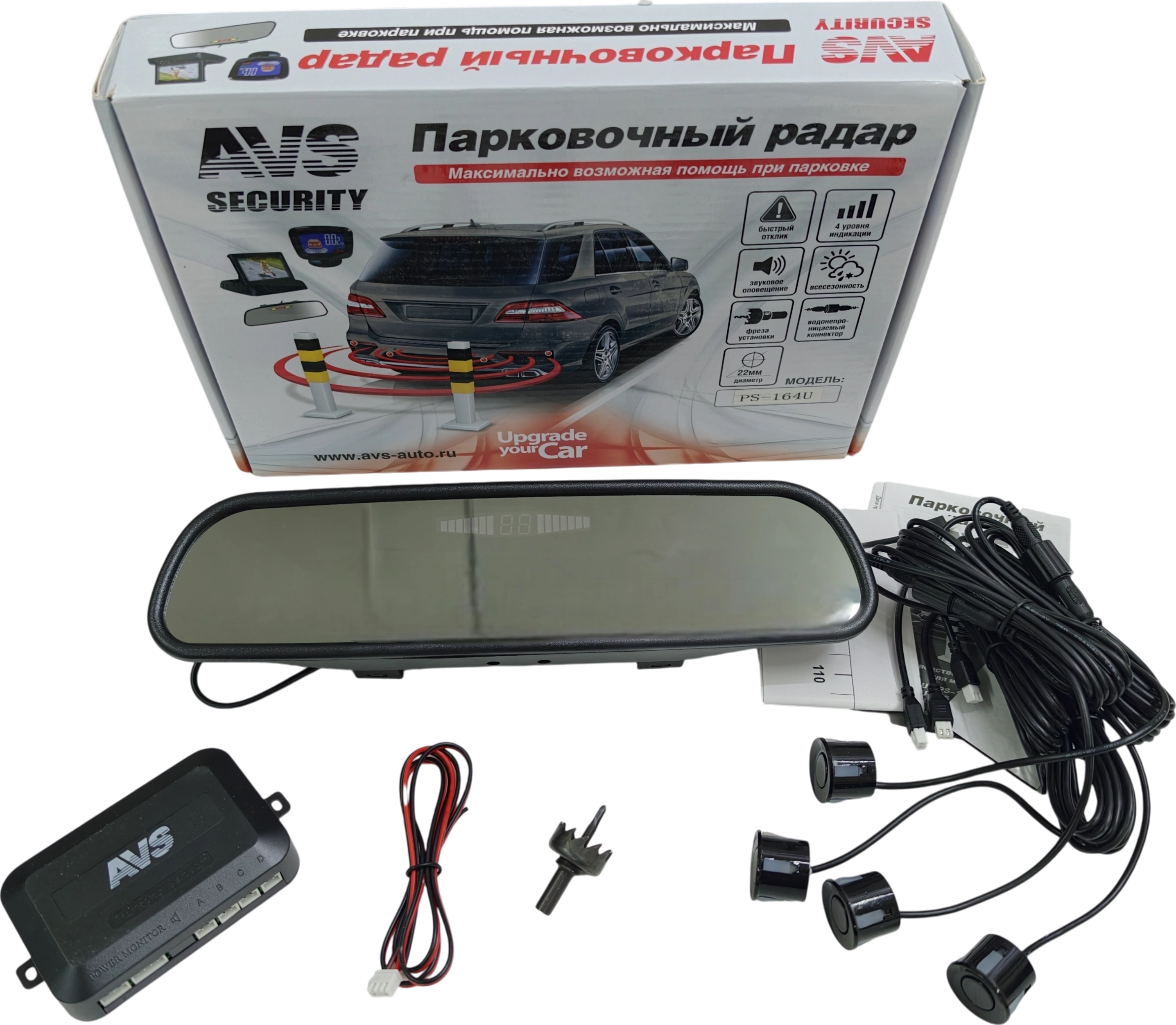 Парковочный радар (парктроник) AVS PS-164U (4 черных датчика) - светодиодный индикатор в виде салонного зеркала, быстрый отклик, диаметр установочного отверстия - 22 мм, звуковое оповещение, водонепроницаемый коннектор