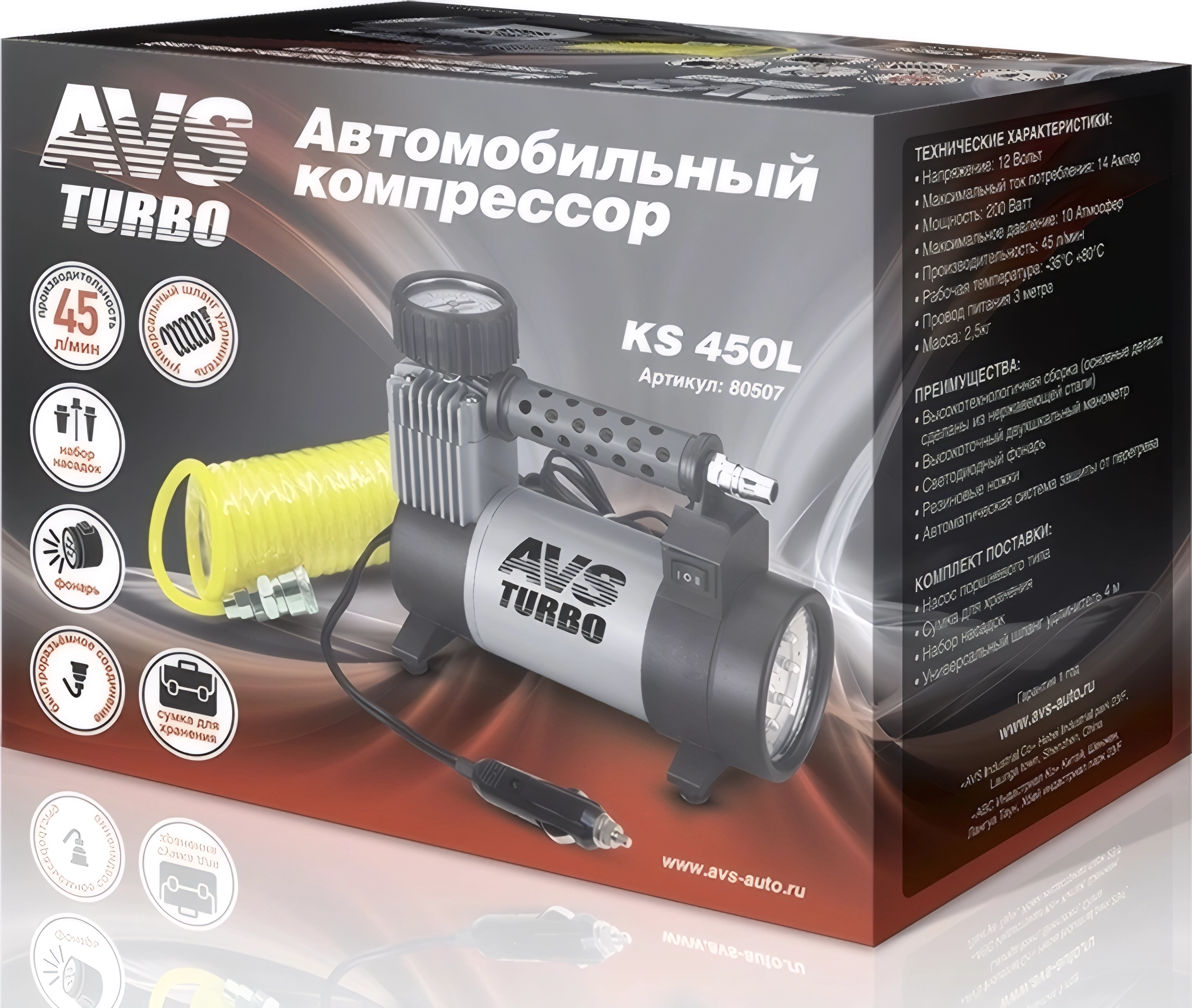 Автомобильный компрессор AVS Turbo KS 450L - водонепроницаемый мотор, хромированный цилиндр, двухшкальный манометр, светодиодный фонарь, набор насадок, резиновые ножки, автоматическая система защиты от перегрева