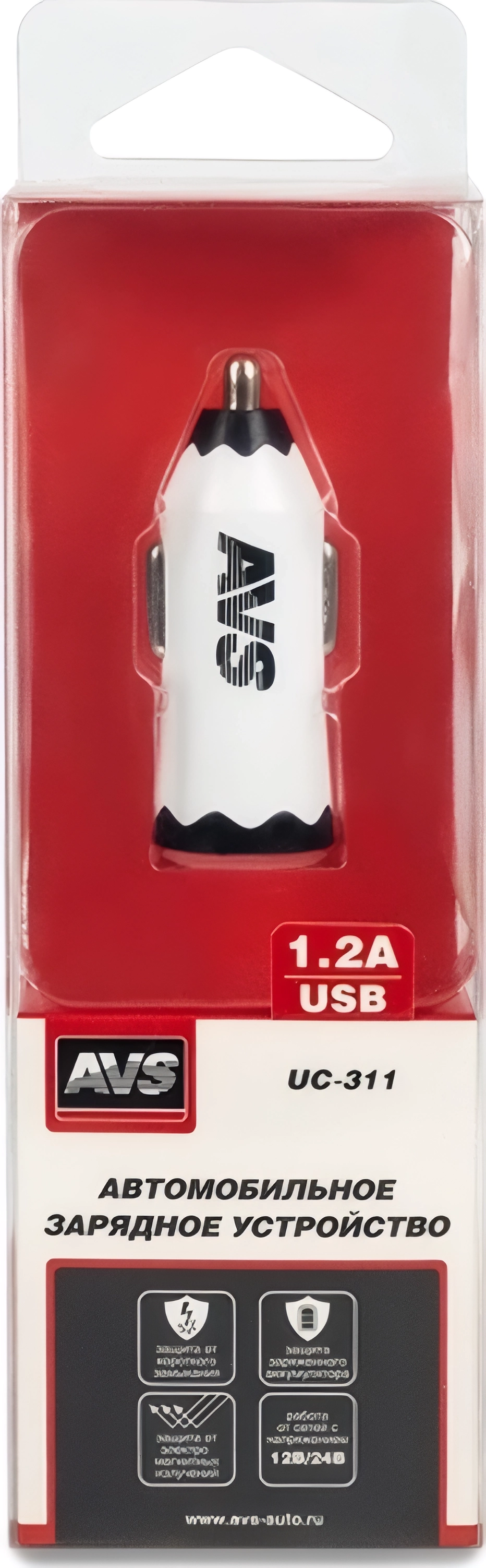 Автомобильное зарядное устройство AVS UC-311 White- 1 x USB, максимальный ток 1,2 А, выходное напряжение 5 В, напряжение питания 12-24В