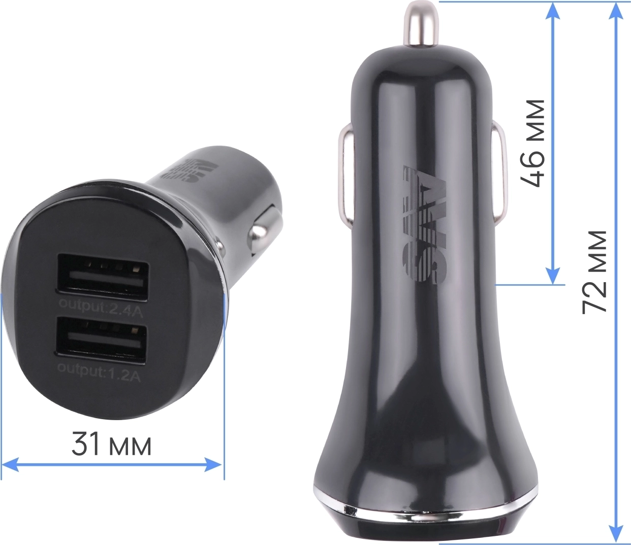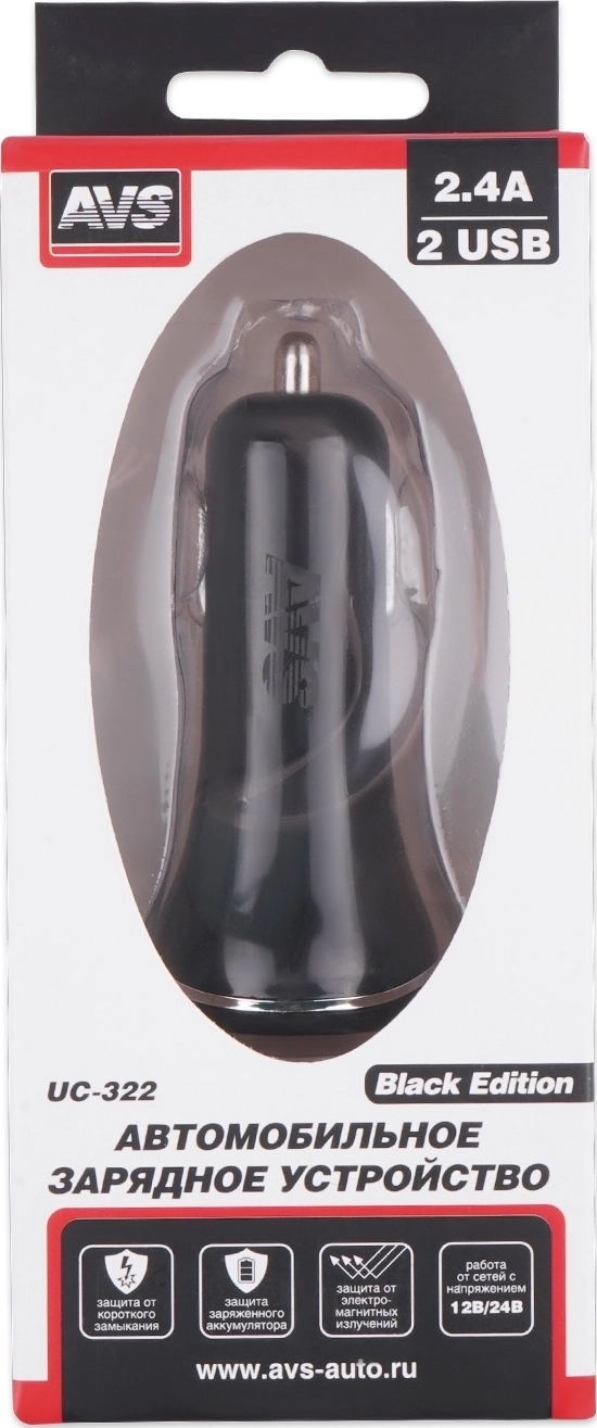 Автомобильное зарядное устройство AVS UC-322 Black Edition - 2 x USB, максимальный ток 2,4 А, выходное напряжение 5 В, напряжение питания 12-24В