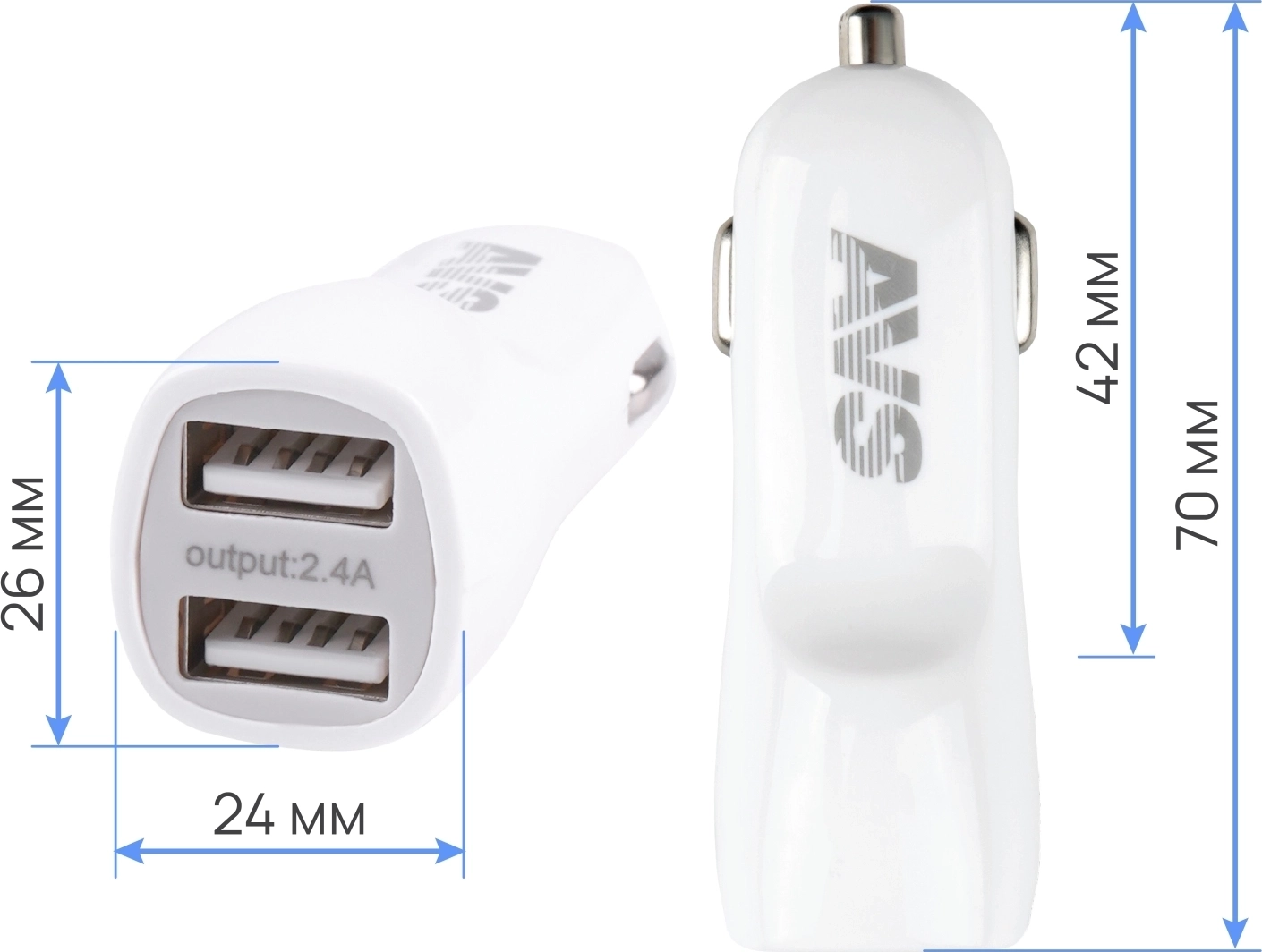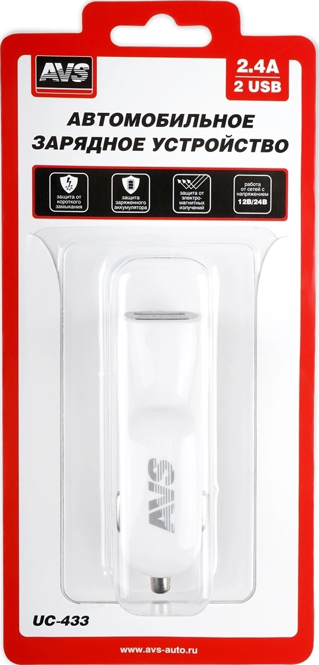 Автомобильное зарядное устройство AVS UC-433 - 2 x USB, максимальный ток 2,4 А, выходное напряжение 5 В, напряжение питания 12-24В