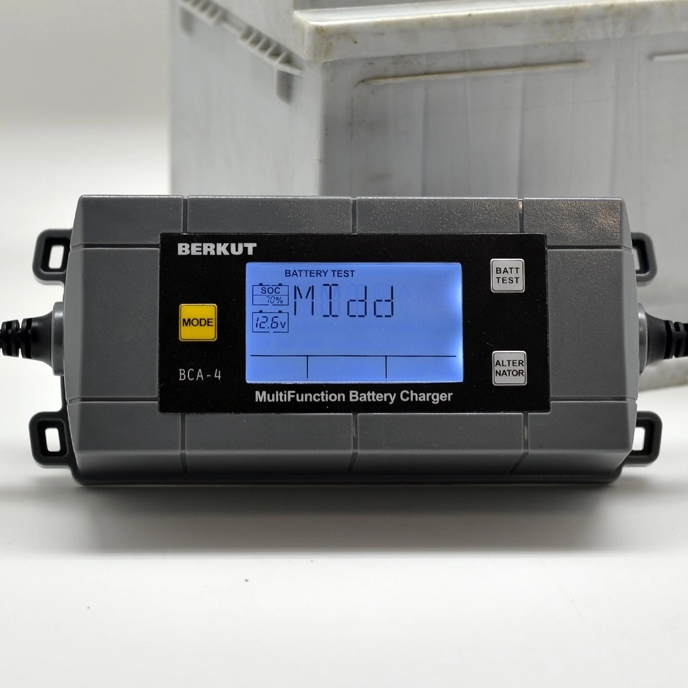 Зарядное устройство Berkut BCA-4 - для любых 12-вольтовых батарей, 9 этапов подзарядки, 5 режимов работы, влагозащищенный корпус, ЖК-дисплей, максимальный ток заряда 4 А