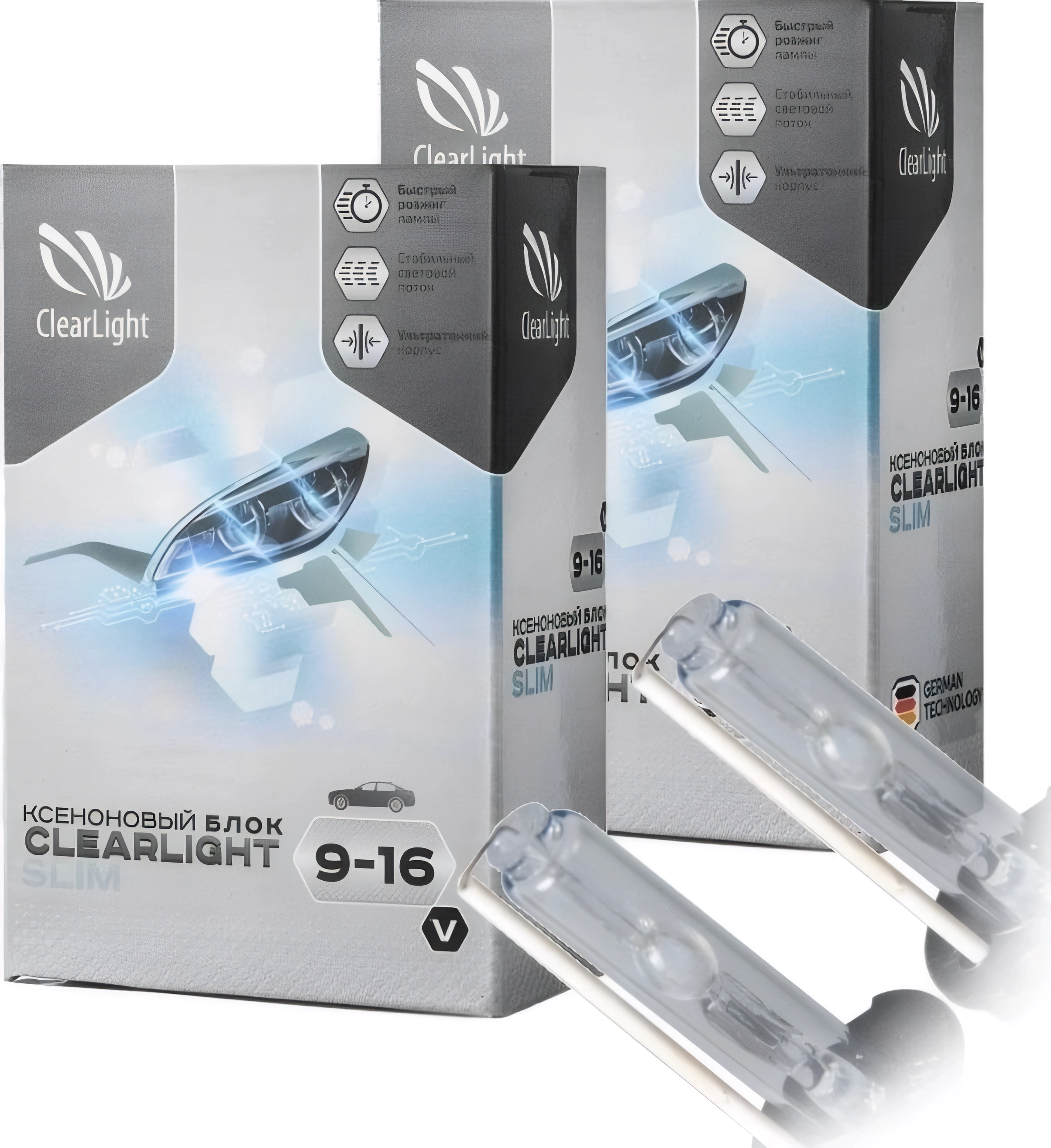По своим техническим характеристикам ксеноновое оборудование превосходит галогенные лампы. При меньшем уровне мощности (35 Ватт) ксенон обеспечивает примерно в два раза больший по силе световой поток. Нагрев ксеноновой лампы меньше, чем у более мощного галогена, а вибрационная стойкость выше по причине отсутствия в конструкции нити накаливания. Комплект ксенона ClearLight Slim отвечает этим требованиям, а за счет небольших по размерам блоков розжига дает свободу выбора при монтаже.