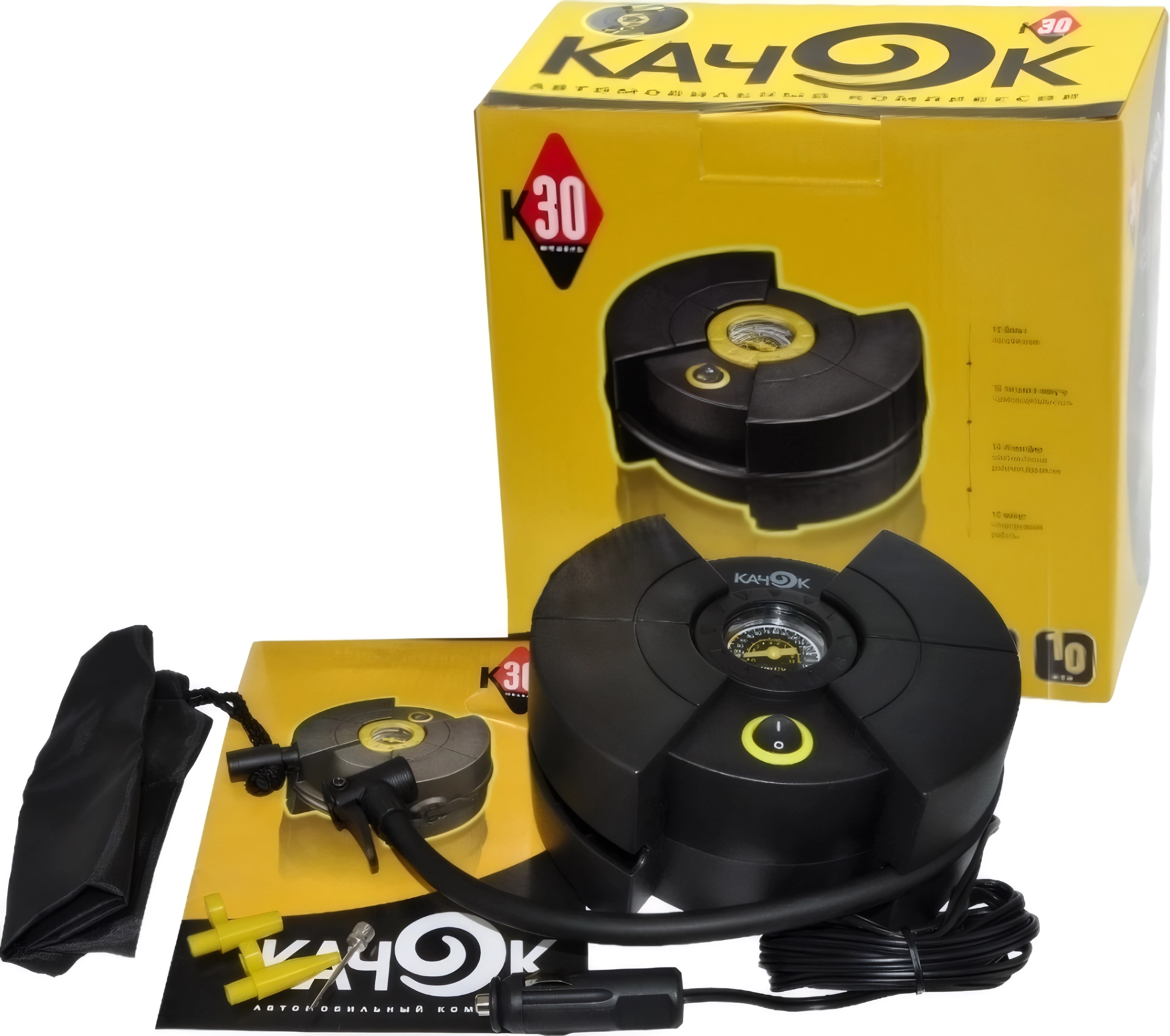 Автомобильный компрессор Качок K30 - компактный корпус, широкий диапазон рабочих температур, сумка-чехол, набор сменных насадок, быстронакидной наконечник