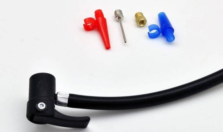 Пользоваться насосом достаточно легко. Он имеет устойчивую платформу, а в комплекте есть 4 вида различных насадок: две насадки для резиновых надувных изделий, насадка для велосипедных шин и насадка для спортивных мячей.