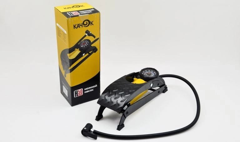Насос ножной Качок Н50 - устойчивая платформа, длинный гибкий шланг, улучшенный ход поршня, встроенный манометр, насадки в комплекте