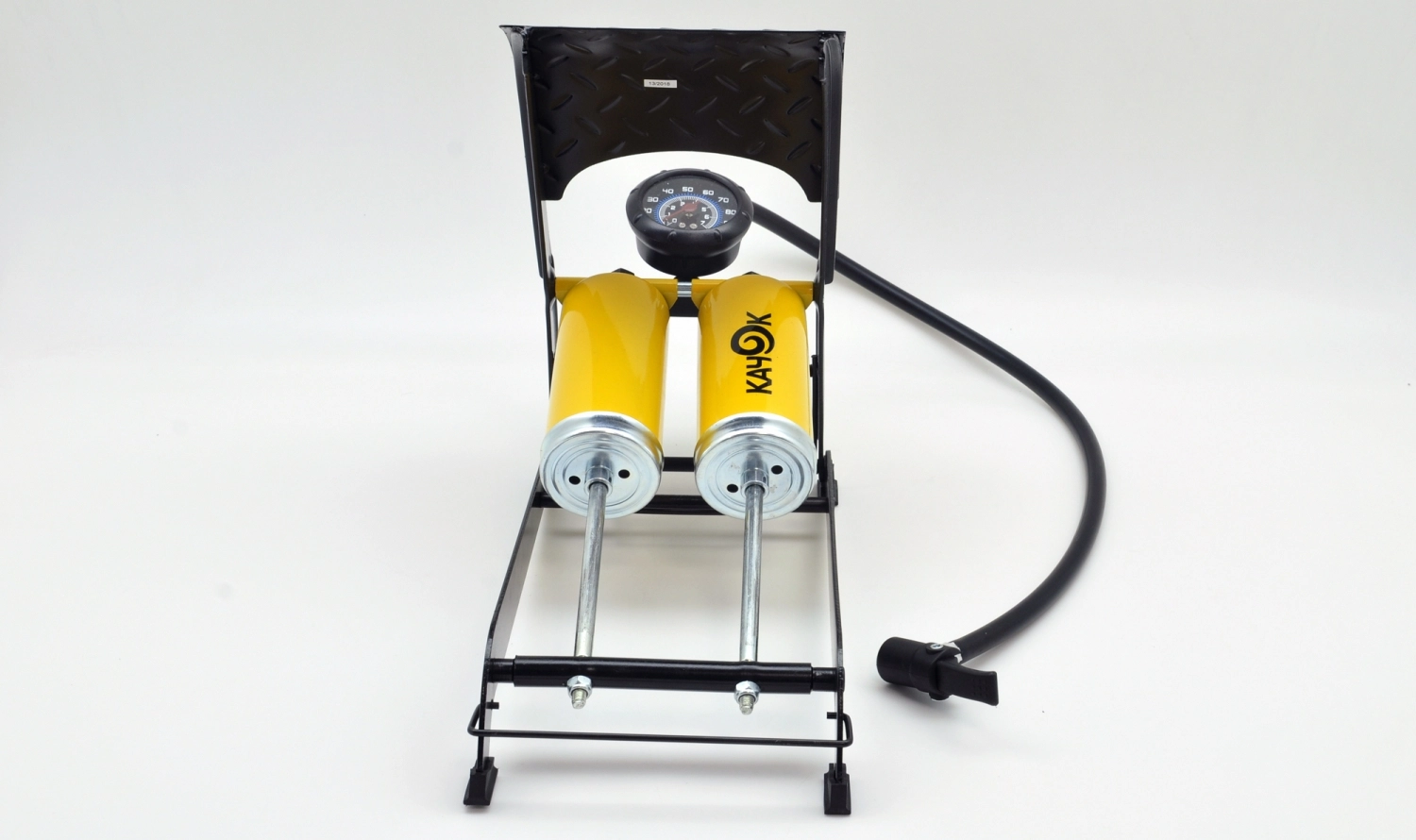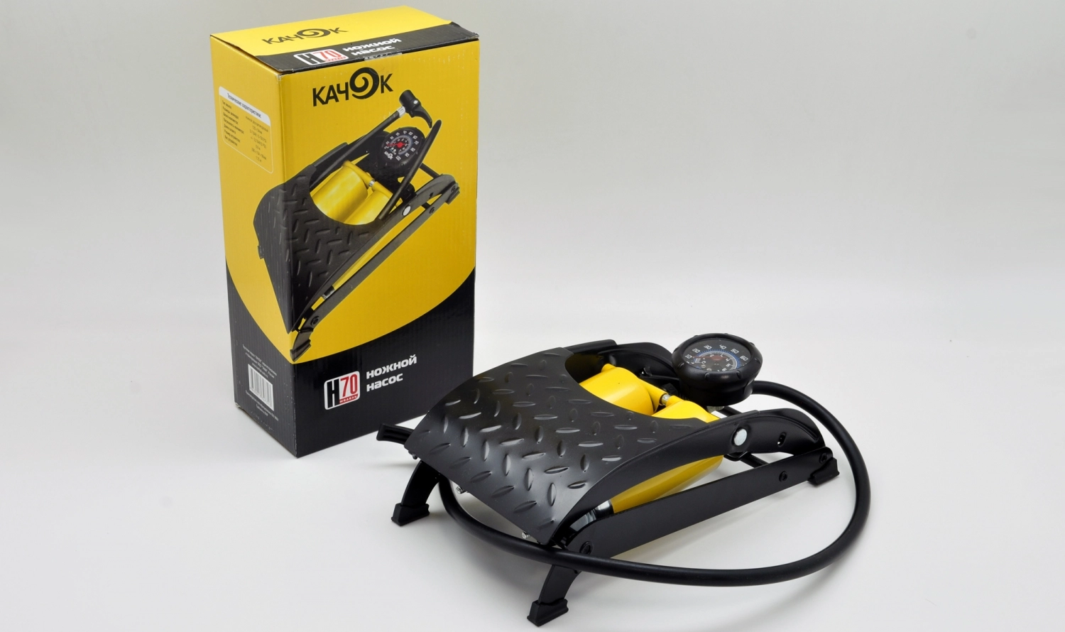 Насос ножной Качок H70 - два цилиндра, встроенный двухшкальный манометр, длина гибкого шланга 60 см, увеличенный ход поршня, быстросъемное соединение