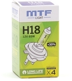 Галогенная лампа MTF Light Long Life +30% H18 (12V/65W) 3000K - страна-производитель - Корея, увеличенная длина луча, яркость - 1700 Lm, цветовая температура - 2900K, долгий срок службы, соответствие международным и европейским стандартам