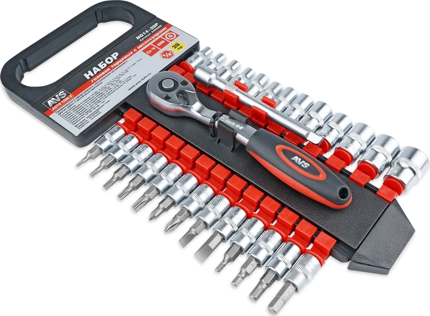 Набор головок торцевых 1/4 DR AVS NG14-28P (4-14 мм) с аксессуарами - 28 предметов, материал хромованадиевая сталь, твердость 45-48 HRC, покрытие сатиновое