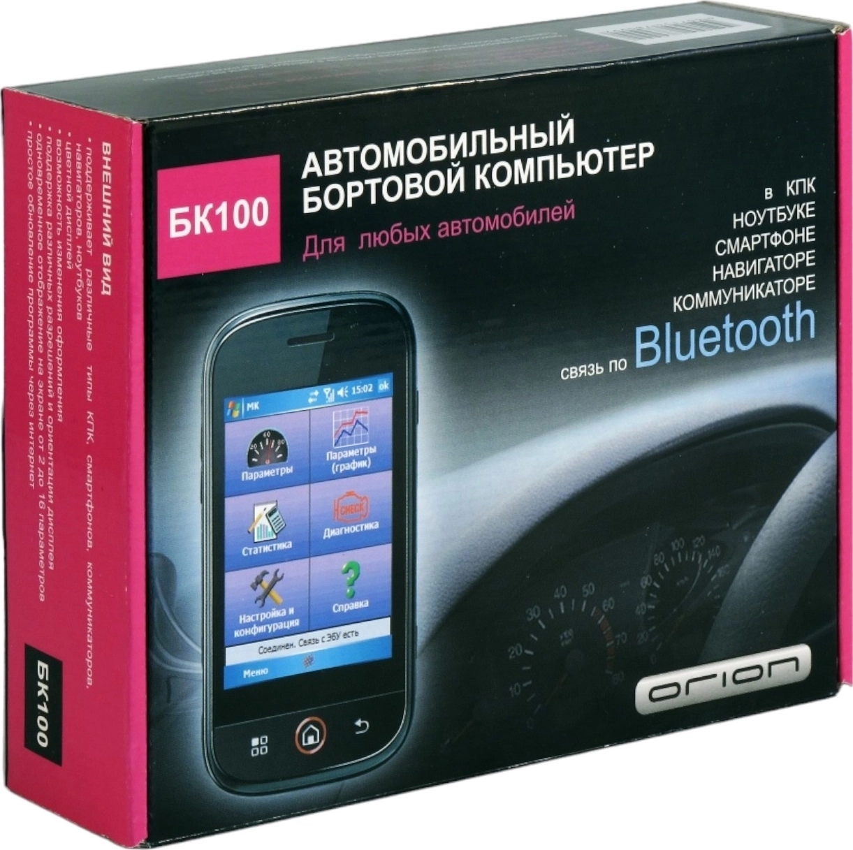 Для того, чтобы Вы могли получать информацию о работе того или иного узла Вашего автомобиля, Вам будет необходимо инсталлировать представленный бортовой компьютер на транспортное средство и установить связь между аппаратом и устройством, на котором Вы собираетесь просматривать интересующую Вас информацию. Соединение между приборами осуществляется по технологии Bluetooth. У Вас будет возможность подключить к БК ноутбук, мобильный телефон, настольный или карманный компьютер (требуется поддержка Java).