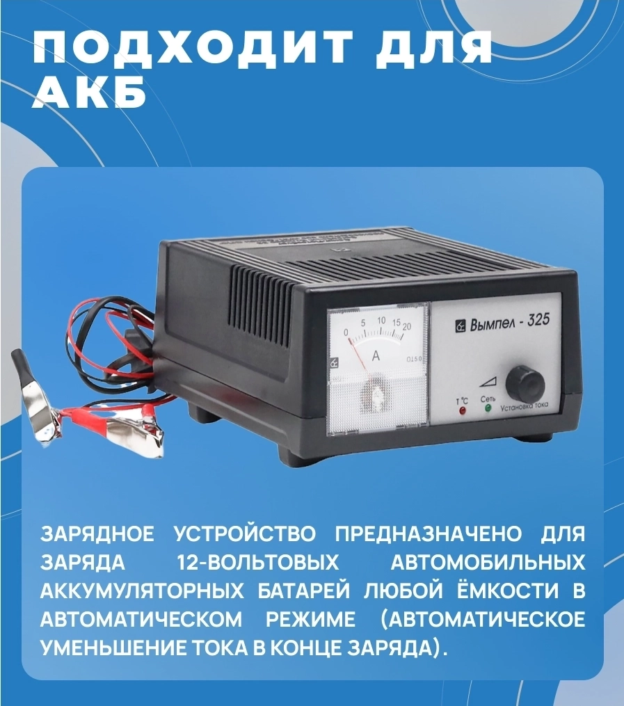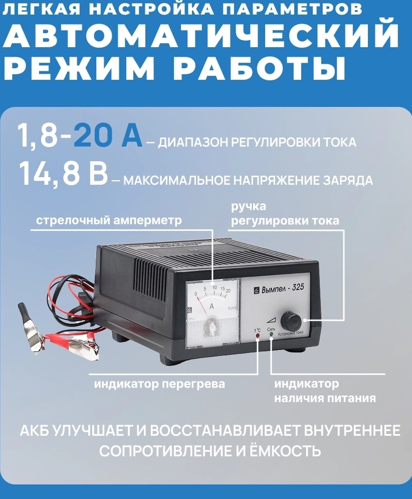 Зарядно-предпусковое устройство Вымпел 325 для автомобильных 12-вольтовых аккумуляторных батарей - регулировка тока в диапазоне 0.8-20 А, двойная защита от перегрева, стрелочный индикатор тока, возможность использования в качестве блока питания